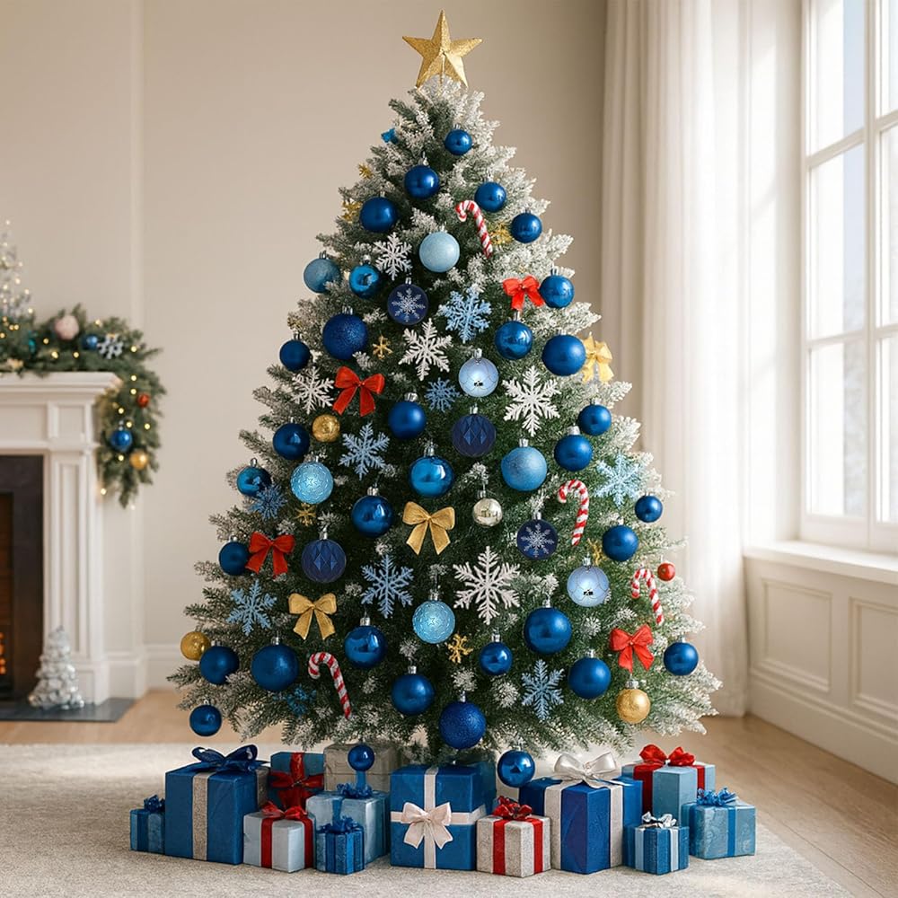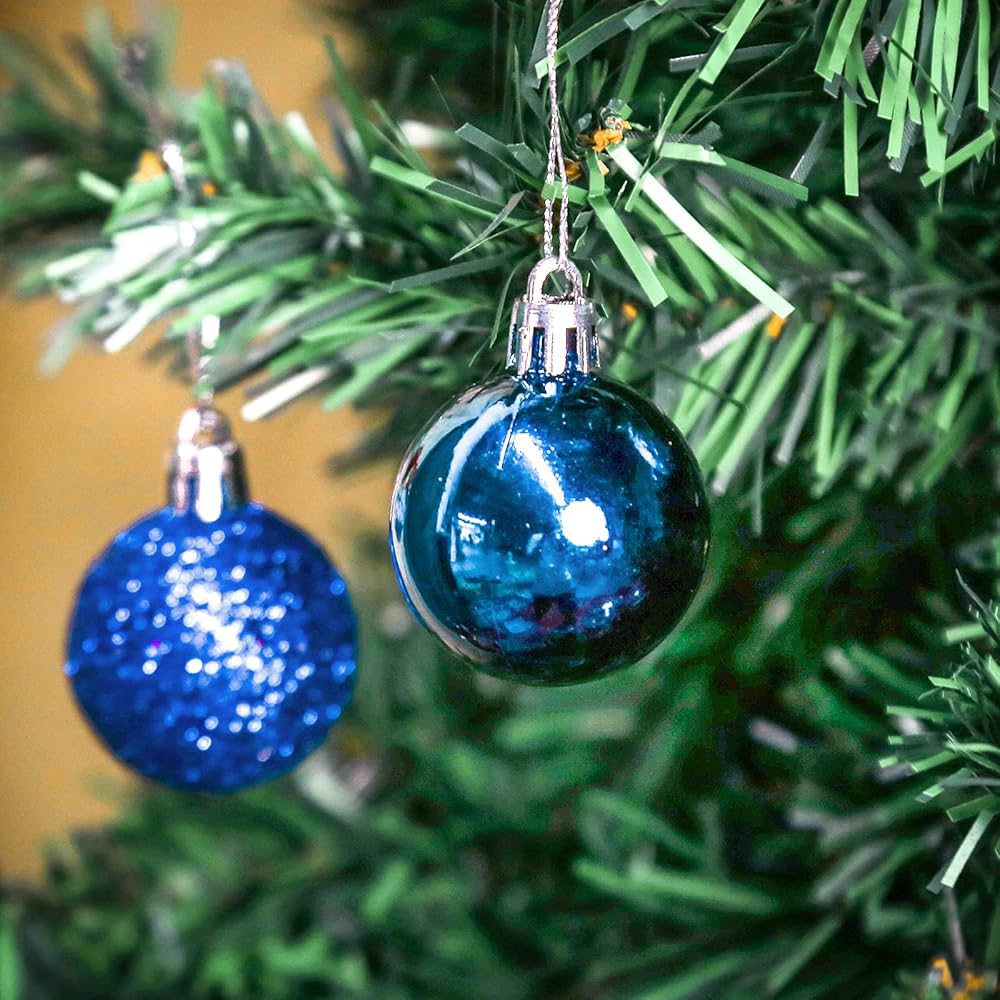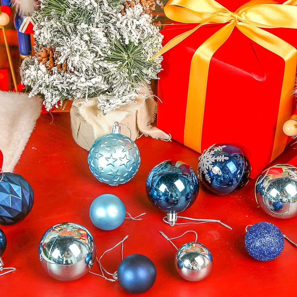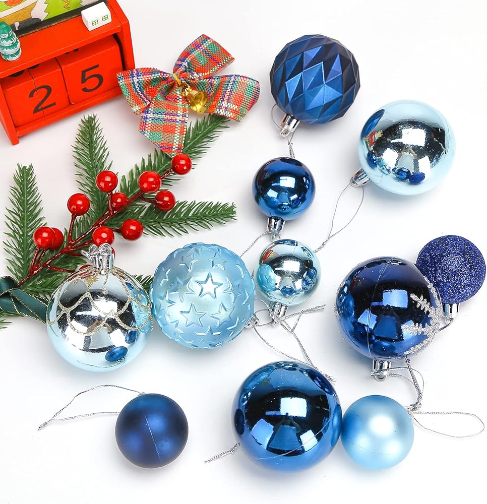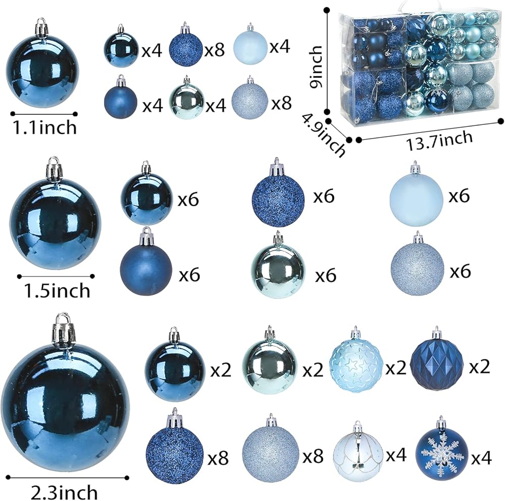 What You Get: 100 pcs blue Christmas balls in 3 different sizes, and with different appearance: shiny, matt, glitter, hand-painted patterns, etc.