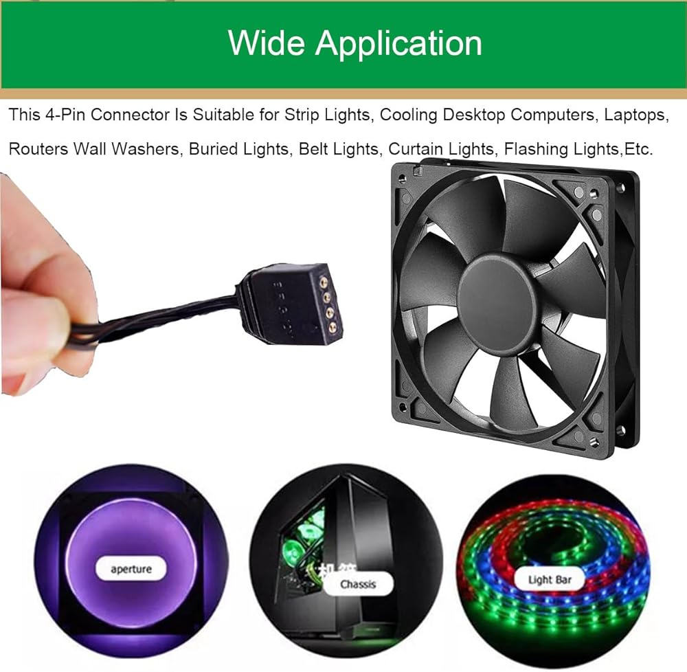 • Application: This 4-Pin Connector Is Suitable for Strip Lights, Cooling Desktop Computers, Laptops, Routers Wall Washers, Buried Lights, Belt Lights, Curtain Lights, Flashing Lights,etc.
