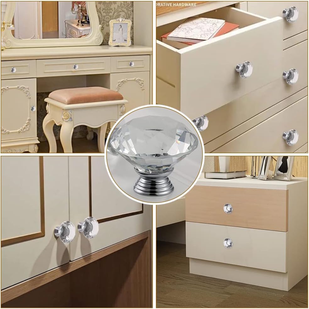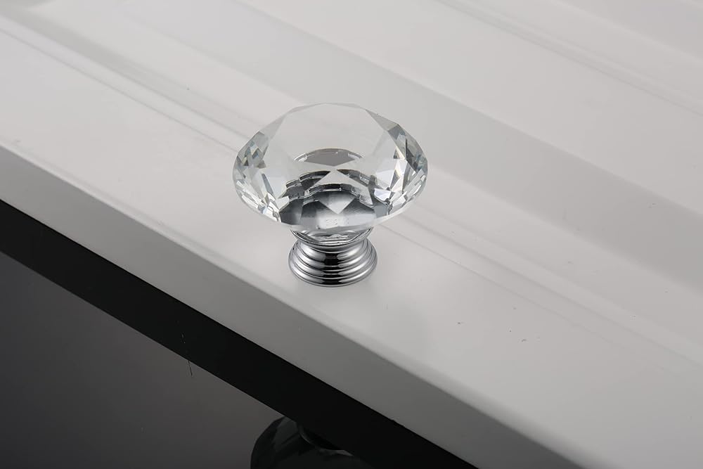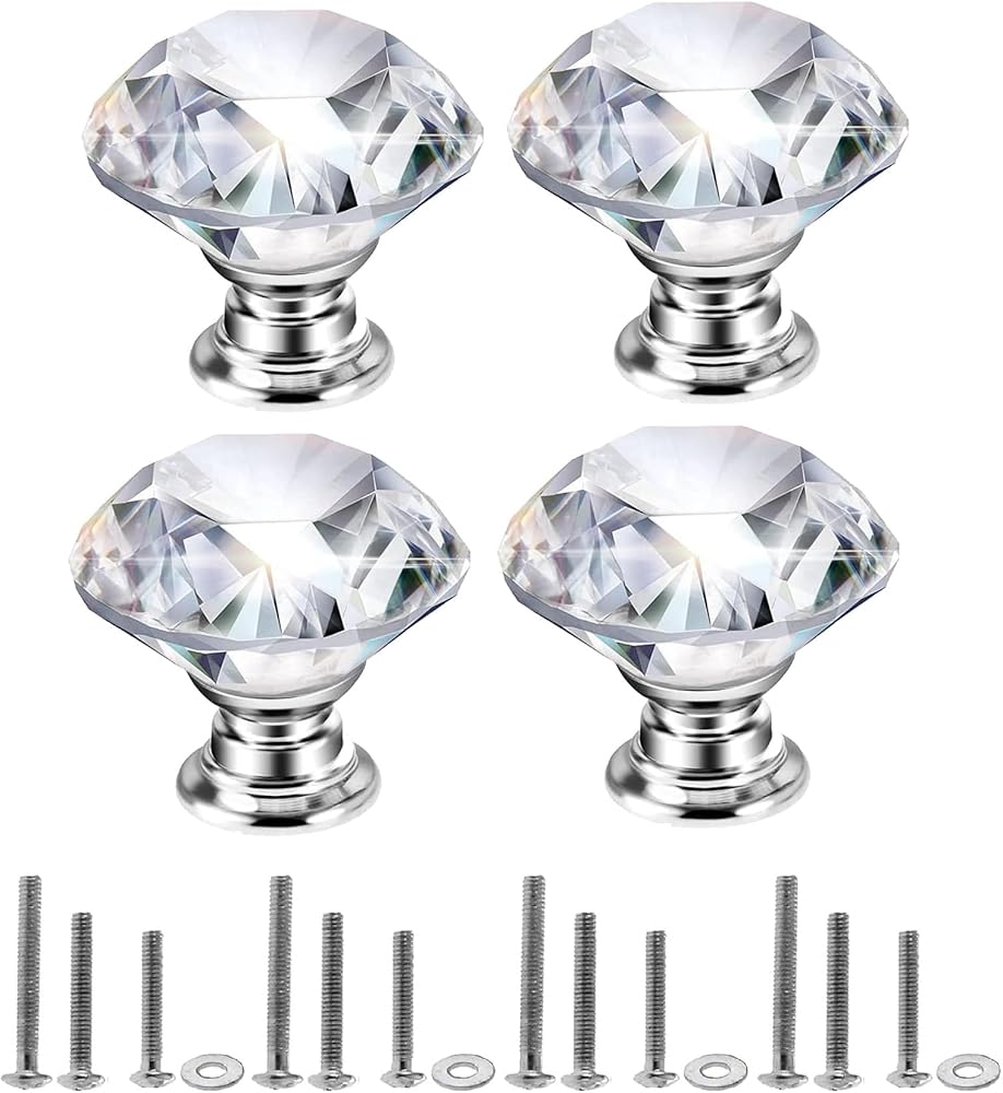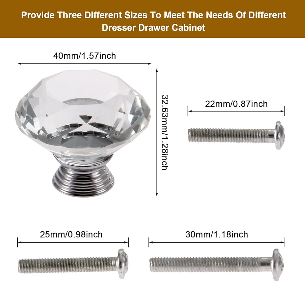 [Package Includes] : Each package contains 4pcs 40mm crystal glass knobs, 12pcs screws of various lengths and sizes (22/25/30mm each 4), and 12pcs gaskets. Different screw sizes to meet different needs