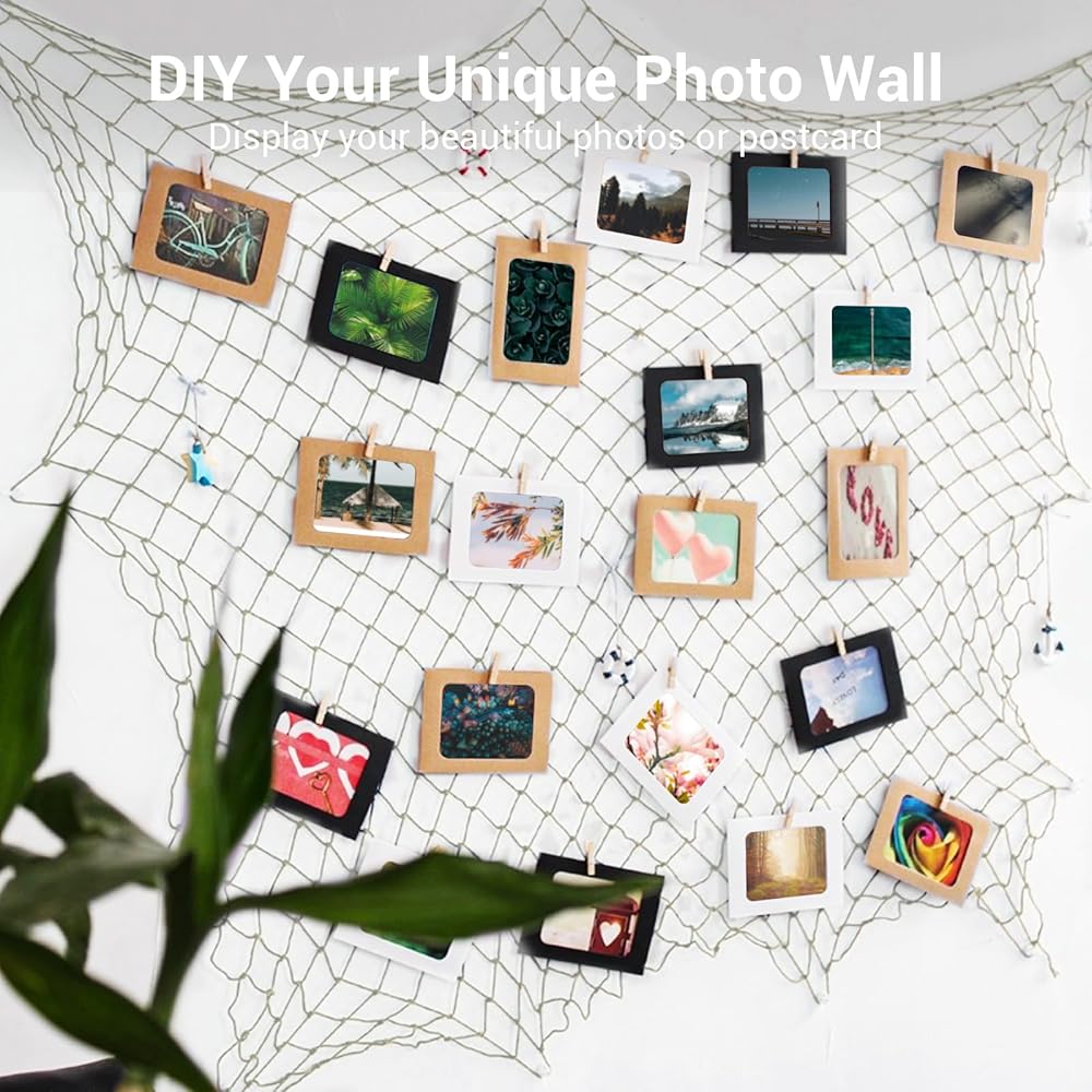 Room Wall Decoraction & Photo Wall Display: The photo net allows you to clip your postcards or photos on the fishing net as a photo display wall. This fish net is great to be wall decoration of beach, nautical, marine themes whether for indoors, outdoors, nesery, kid room, bedroom, living room, reataurant, café, grocery, etc.