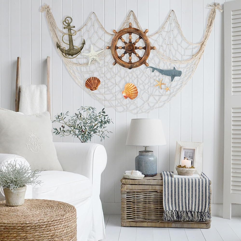 DIY Your Own Ornament: Unleash your imagination and combine this decorative fishing net with other marine themed ornaments such as seashells, starfish, sailboat, lighthouse, lifebuoy and various fish decors to create a charming, cohesive sea-themed atmosphere and whatever other themed decoration you want.