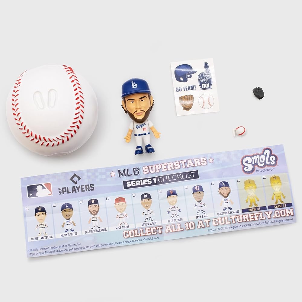 Smols figures are packaged in blind box packaging, EACH ORDER IS FOR ONE RANDOM FIGURE. Due to the blind box nature of the packaging, we are unable to a specific figure.Step up to the plate and take a swing at these mystery mini Smols vinyl figurines. Which MLB Superstar will you get Start your collection:Series 1 SuperstarsChristian YelichMookie BettsJustin VerlanderMike TroutAaron JudgePete AlonsoJavy BaezClayton KershawMike Trout Gold EditionAaron Judge Gold EditionOfficially licensed.