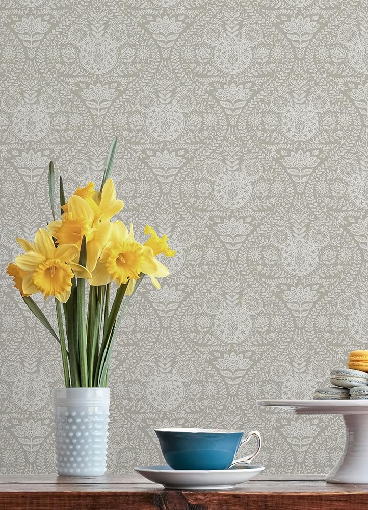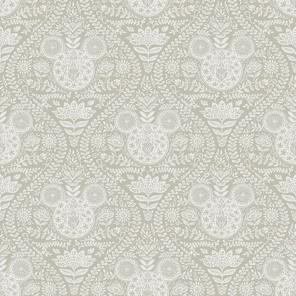 An intricate, Scandinavian-inspired ogee pattern adorned with whimsical florals, scrolling greenery, and the iconic Disney Mickey Mouse emblem on RoomMates peel and stick wallpaper. Perfect for any Mickey Mouse lover's home, this print brings the adoration of Disney to life in just Peel, Stick…Done!® Disney Mickey Mouse Blue Block Print Peel and Stick Wallpaper comes on one roll that measures 20.5 inches wide by 18 feet long.