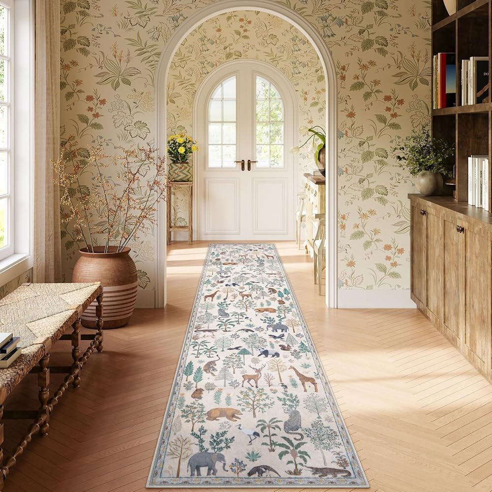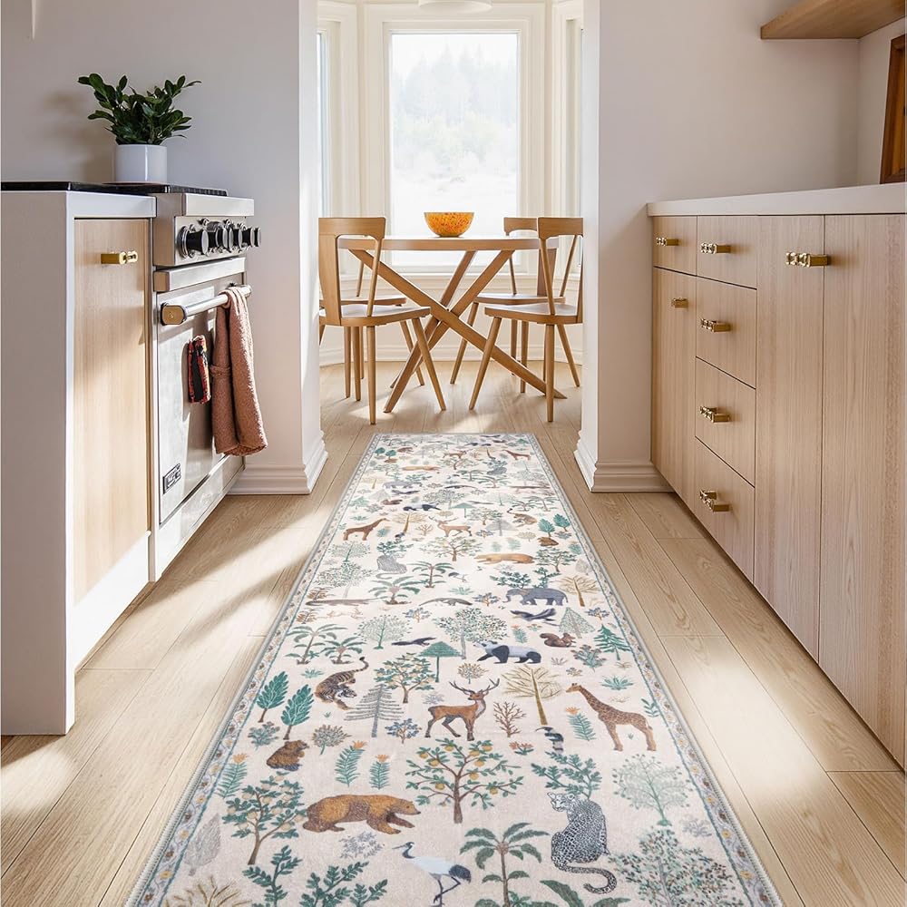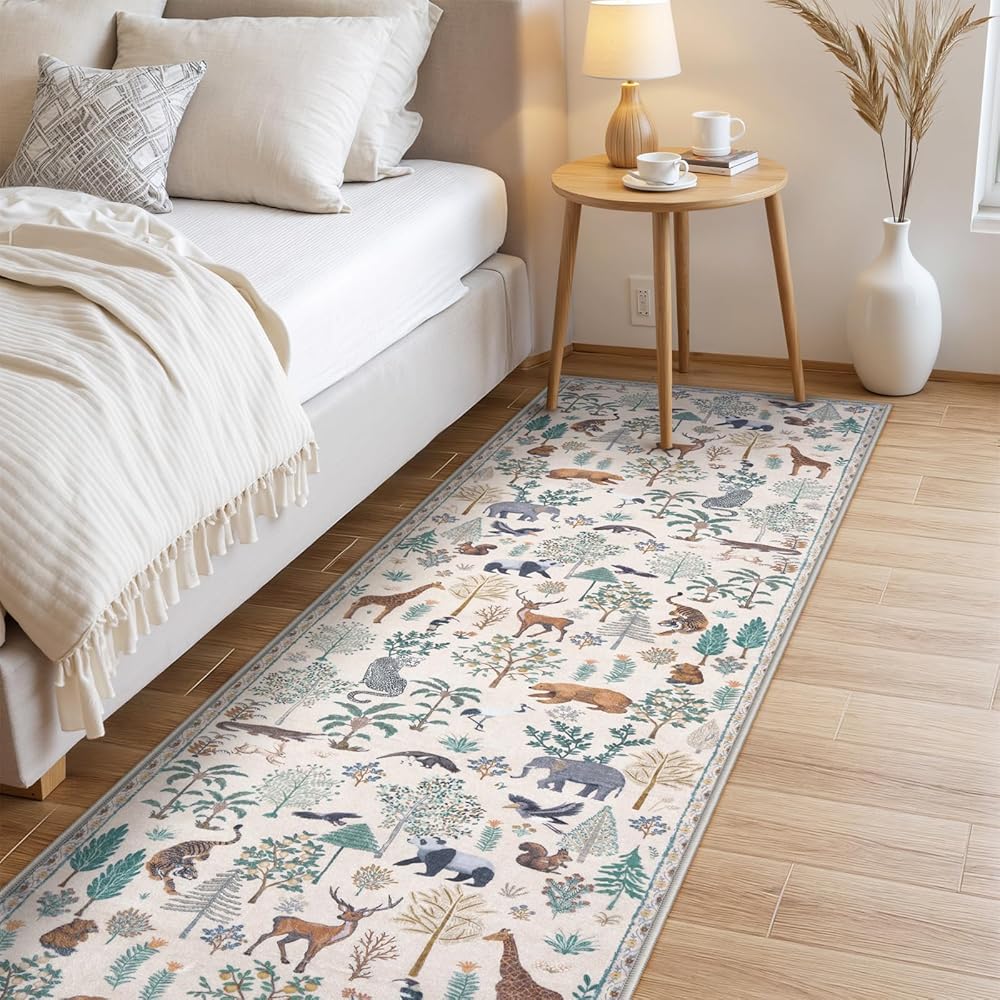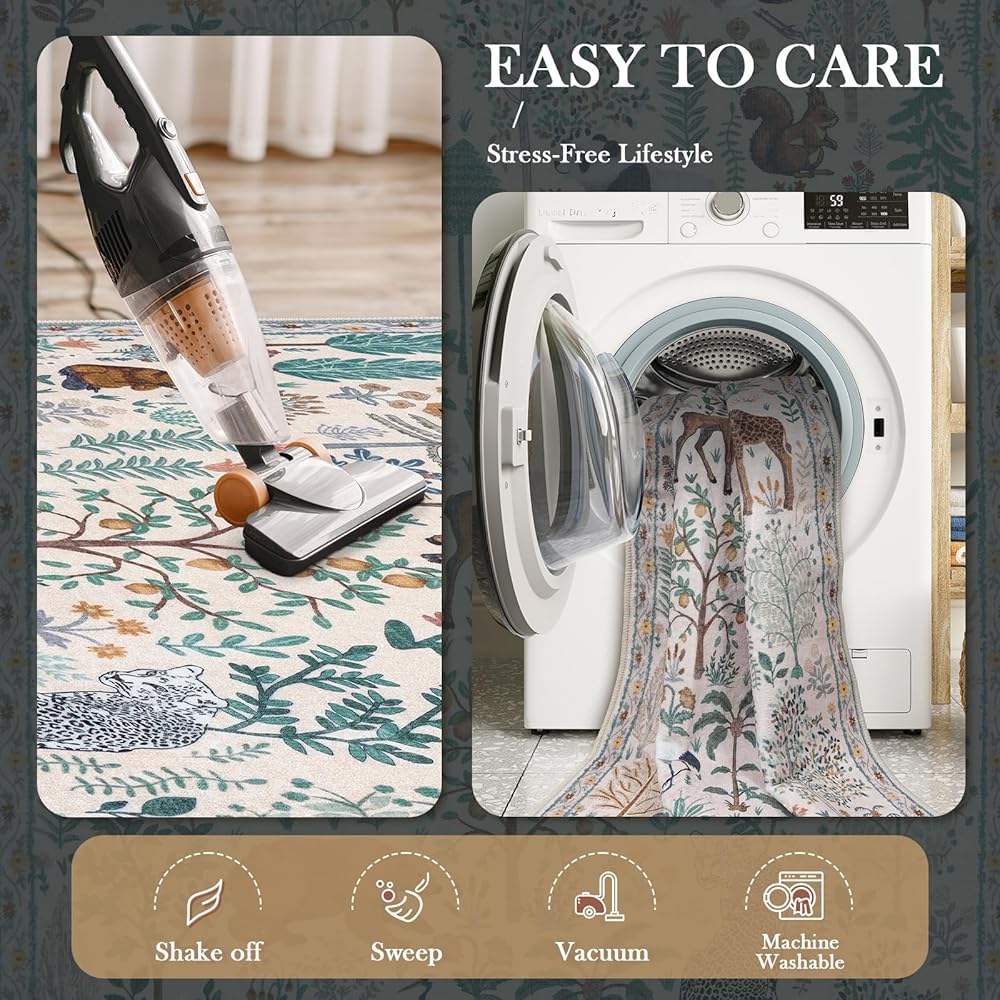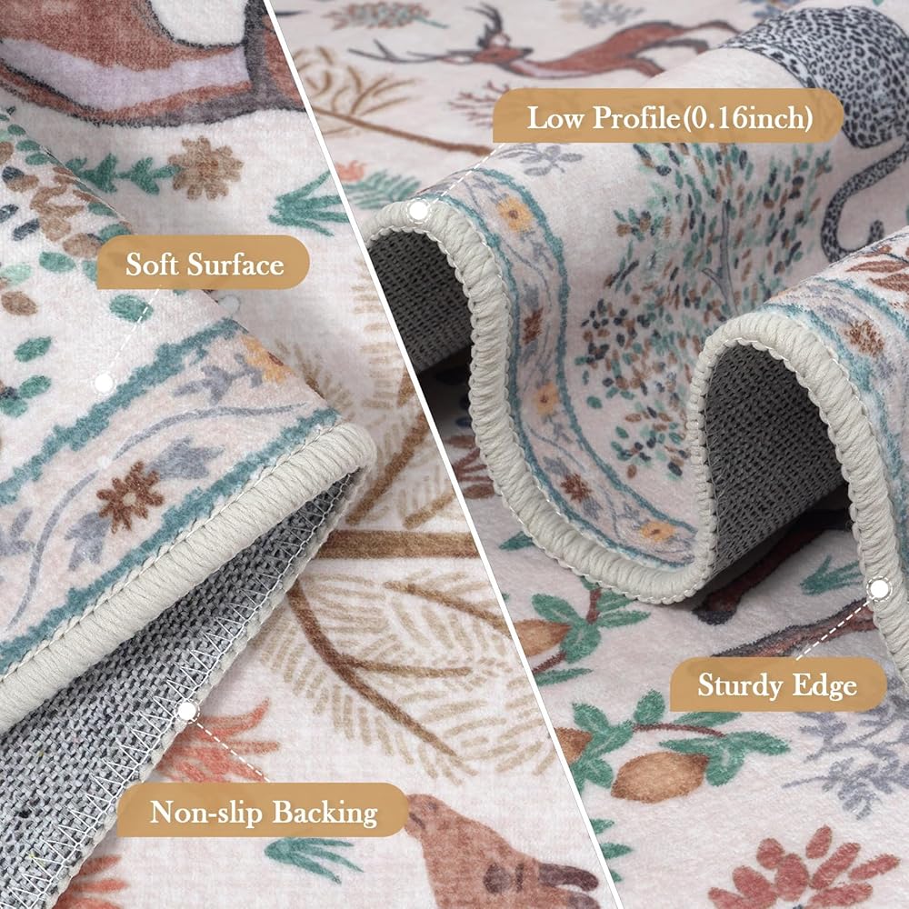 【Soft & Low Pile Rugs】LEEVAN forest and animal print carpet is made of ultra-dense machine-woven faux wool that is soft to the touch and durable enough to be warm and comfortable to walk barefoot. The low-pile design fits into any space and can be placed in doorways, under doors, and over furniture without blocking the way.