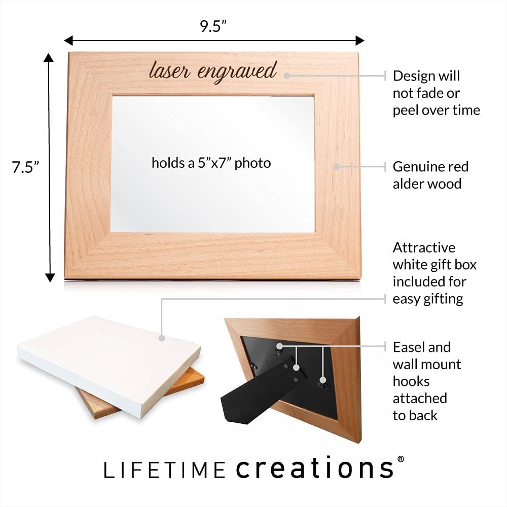 High quality laser engraving made to last: our custom photo frame is designed and carefully engraved in Merrillville, IN; the frame laser engraves dark brown, creating a beautiful contrast against the alder wood