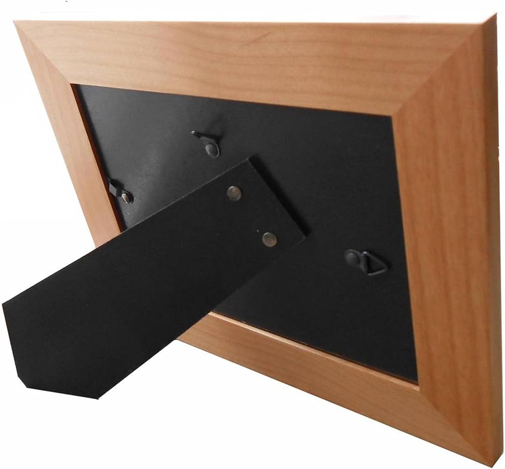 Size & material: holds a 5 inch x 7 inch photo and has a glass insert; measures 7.5 inches x 9.5 inches overall; made of genuine alder wood - wood grain may vary; both an easel and wall mount hooks are attached to back of frame for easy displaying