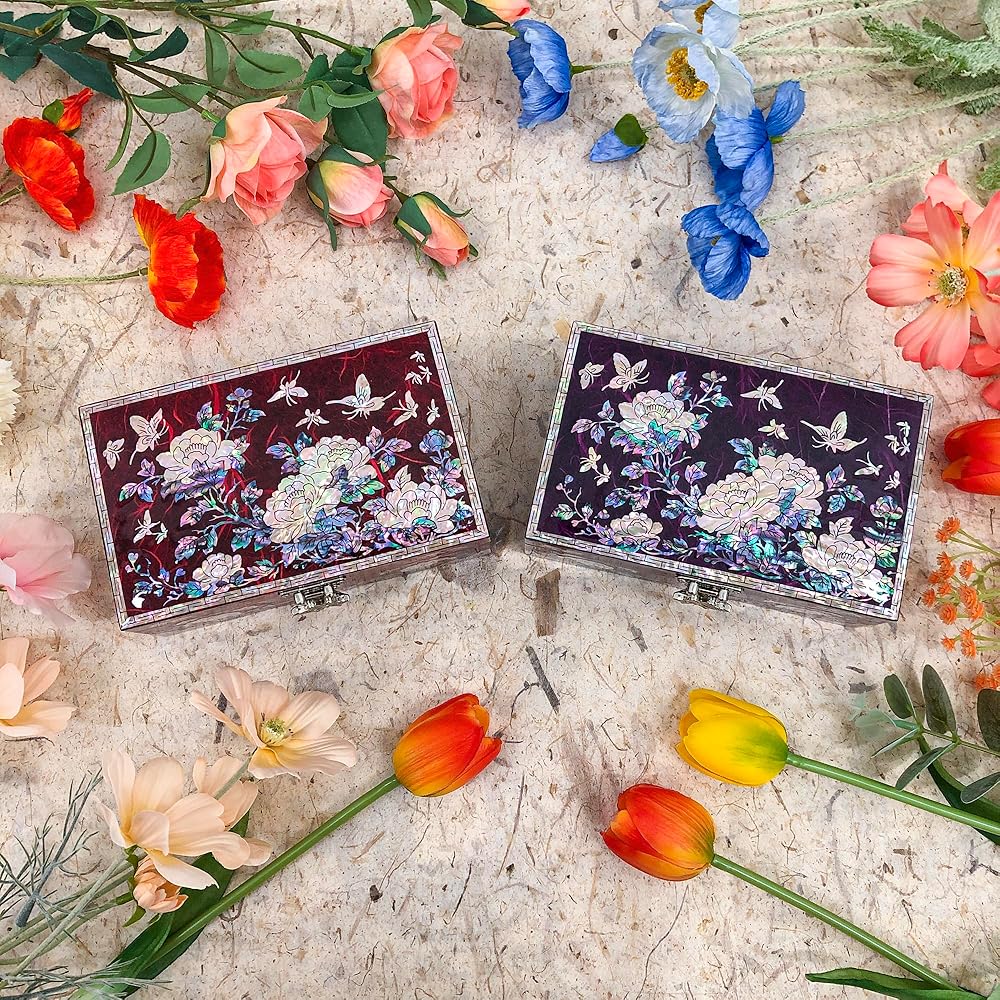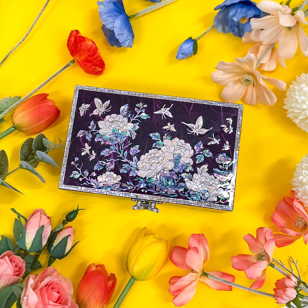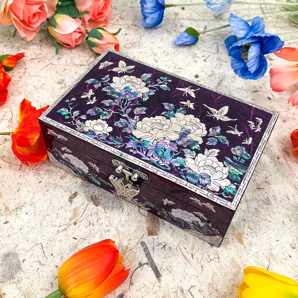 Glamorous design : Jewelry box featuring a glamorous design accentuated by glossy, Peony Hanji mother-of-pearl, adding a touch of sophistication to its aesthetic