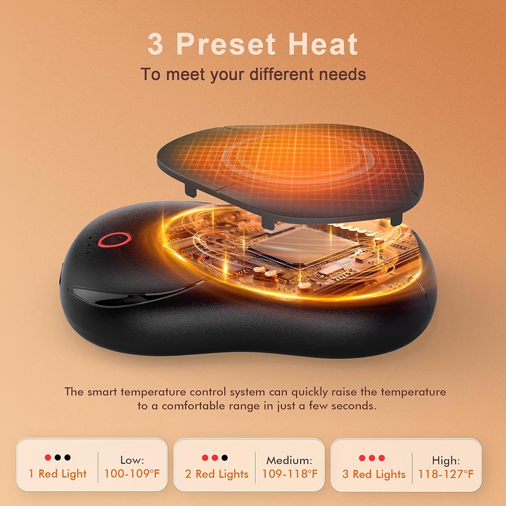 Quick Warmth and Smart 3 Temperature Settings: Our portable heater fast warms up in just 3 seconds (Max gradually reaching up to 125.6°F ). Experience instant comfort with our rechargeable hand warmers, eliminating the need for long waits. You can choose the temperature level that suits your needs: 1 for indoor comfort, 2 for soothing sore joints, and 3 for staying warm outdoors.