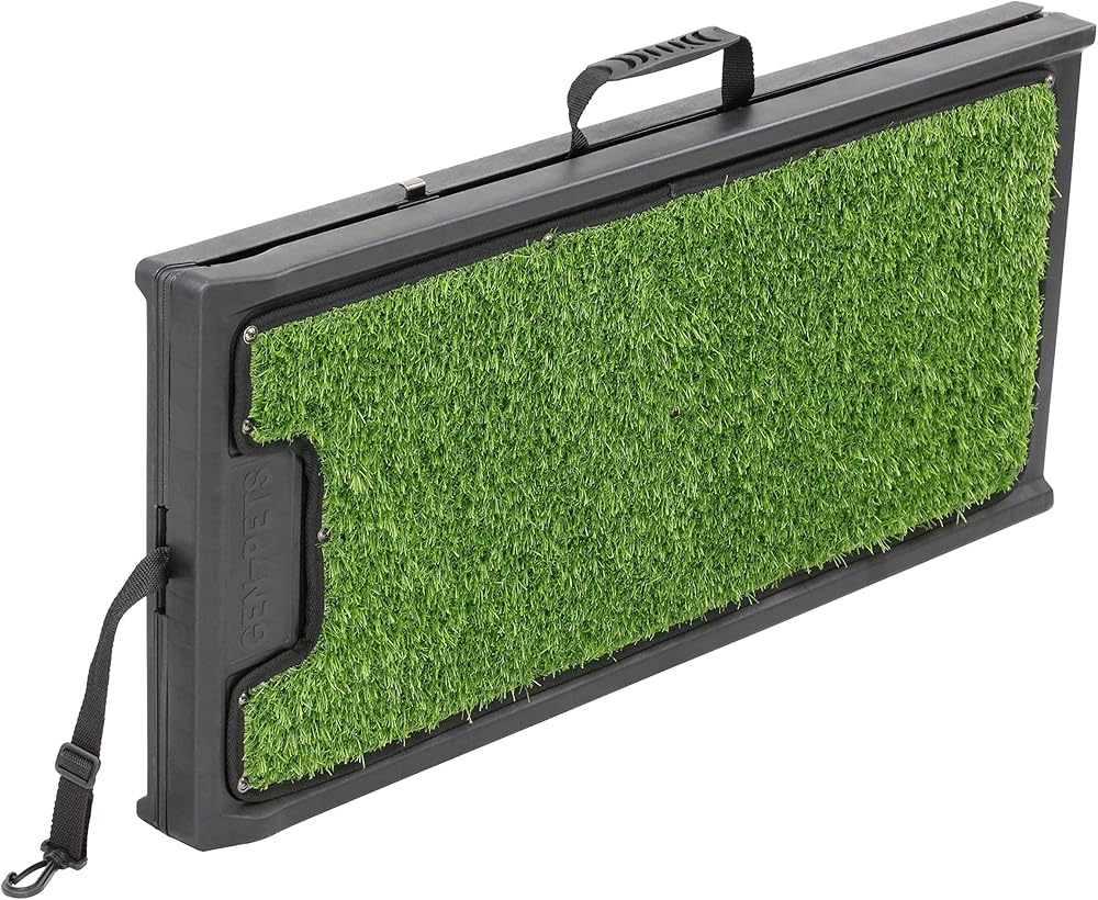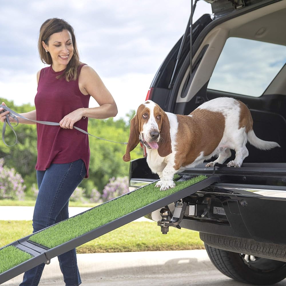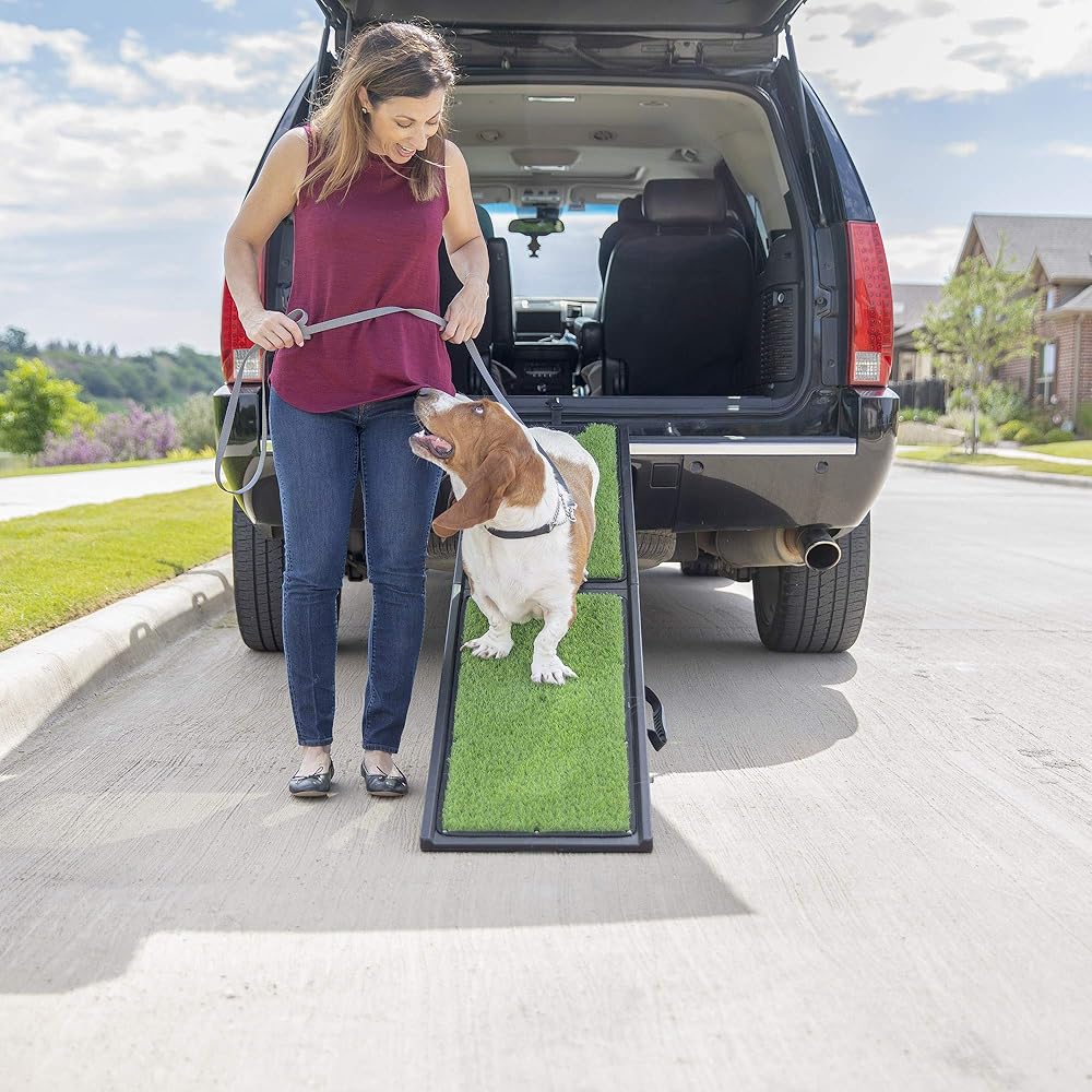 Easy On The Go: Your dog will feel safe to walk up and down its 16" wide walking path covered in poly-grass for a better grip; The ramp's lightweight design and soft rubber grip handle makes it easy to transport and carry