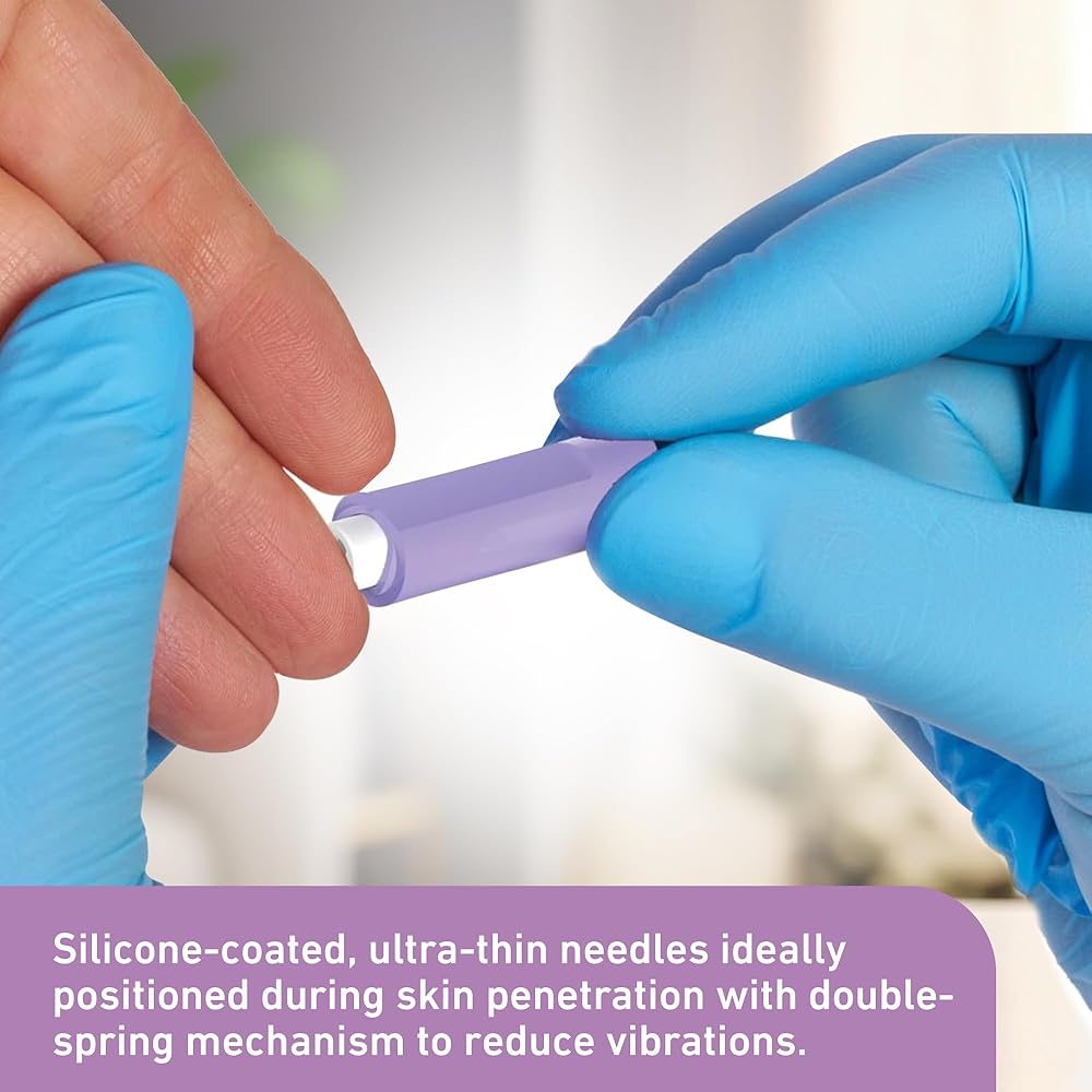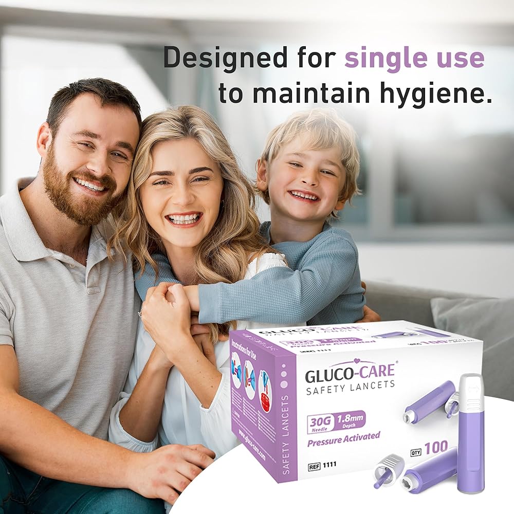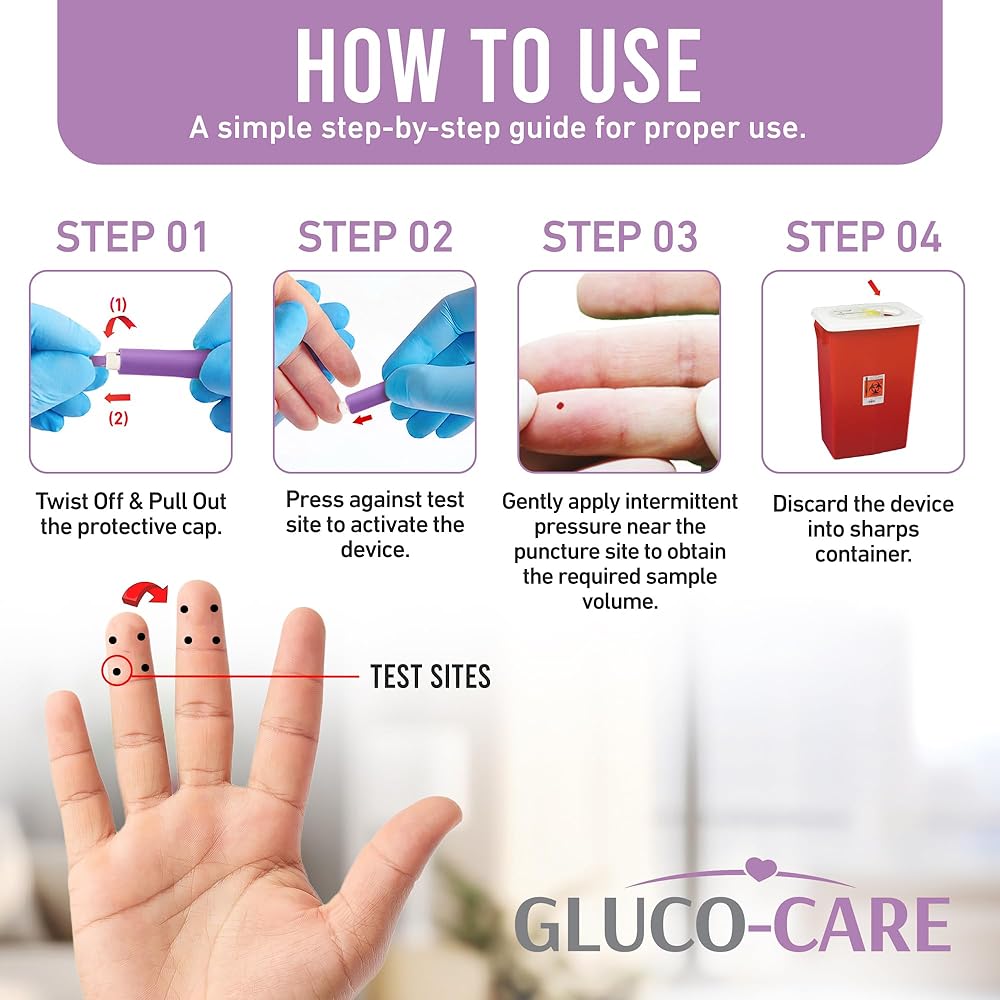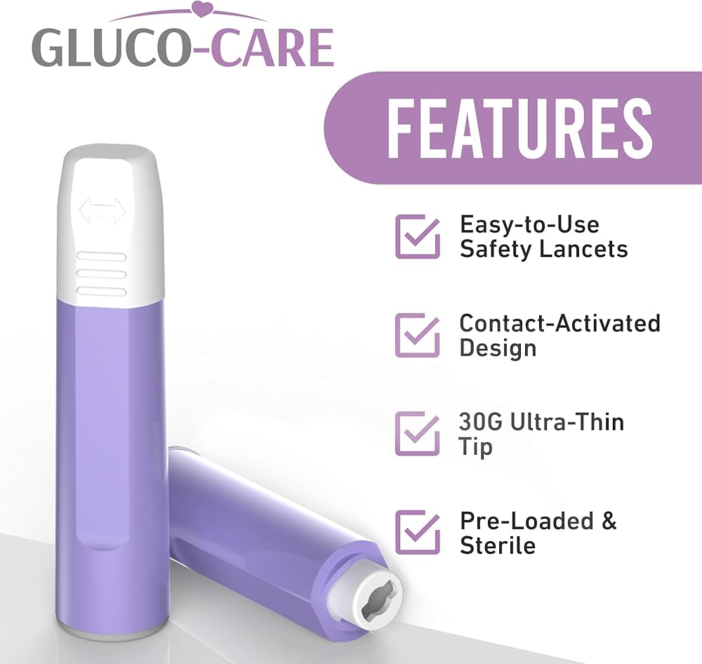 GLUCO-CARE Safety Lancets are designed for safety, comfort, and ease of use. They are contact activated, which means they automatically activate when the main housing is pressed against the skin. They needle retracts automatically, reducing the risk of accidental needle sticks. The lancets are 30G x 1.8 mm in size, which is suitable for most diabetics. They come in a box of 100, and are non-returnable, making them a cost-effective choice for those who need them on a regular basis. The lancets are also designed to be comfortable to use, with a thin needle point that minimizes discomfort during insertion. Overall, GLUCO-CARE Safety Lancets are a reliable and safe choice for diabetics who need to test their blood glucose levels.
