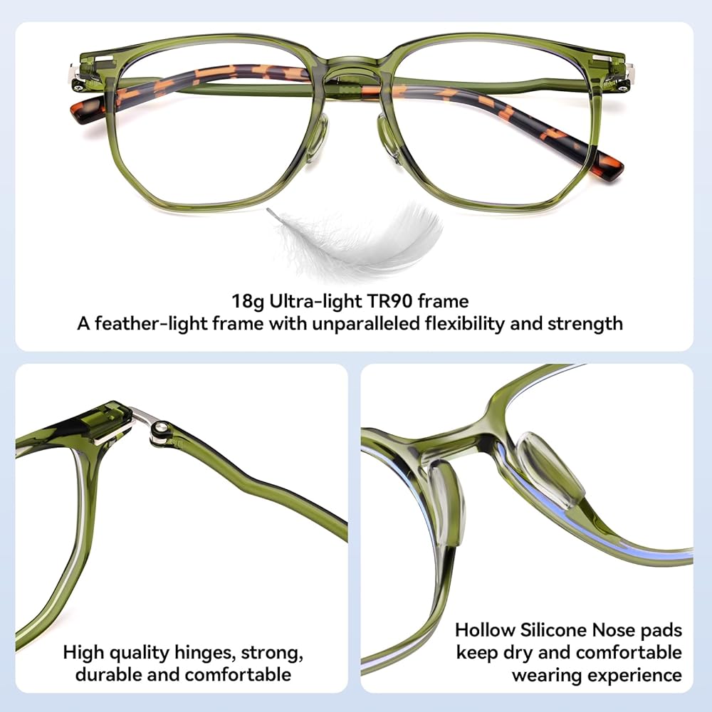 Redefine Elegance and Comfort: Women's Oversized Blue Light Blocking Glasses Introducing our women's oversized blue light blocking glasses—a perfect blend of style, comfort, and protection. Designed for the modern woman, these glasses are not just an accessory but a necessity for maintaining eye health in today's digital age. Feather-Light Comfort with High-Quality TR Frames Our glasses are crafted with high-quality ultra-light TR frames that provide unmatched comfort without compromising on durability. These frames are so light, you'll forget you're even wearing them. Whether you're powering through a workday, scrolling through social media, or catching up on your favorite shows, these glasses ensure that your comfort is never compromised. Innovative Hollow Nose Pad Design for Breathability One of the standout features of these glasses is the unique hollow nose pad design, which increases breathability and reduces the chances of slipping, even during extended wear. The added silicone sleeve further enhances comfort by reducing pressure on the nose, making these glasses ideal for all-day use. Oversized Square Frame: A Fashion-Forward Choice Fashion meets function with the oversized square frame, designed to flatter and enhance your facial features. This trendy design not only makes a bold style statement but also provides ample coverage, ensuring maximum protection from blue light. The frame is particularly suitable for women with smaller face shapes, offering a perfect fit that's both chic and practical. Effective Blue Light Blocking for Eye Protection Our blue light blocking glasses are equipped with lenses that effectively filter out harmful blue light emitted by screens. By reducing blue light exposure, these glasses help protect your eyes from strain and fatigue, allowing you to focus on what matters most—whether that's working, studying, or simply relaxing.