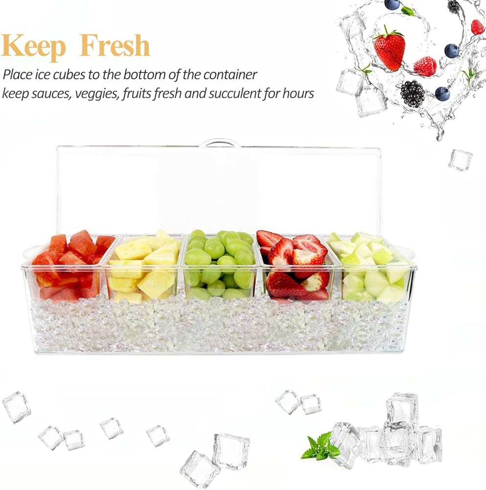 REMOVABLE 5 COMPARTMENTS: Features 5 spacious compartments (each size: 5.83" x 3.62" x 2.83") which can be removed easily. the chilled condiment server is effortless to refill. Besides, 6 spoons, 2 tongs are included.