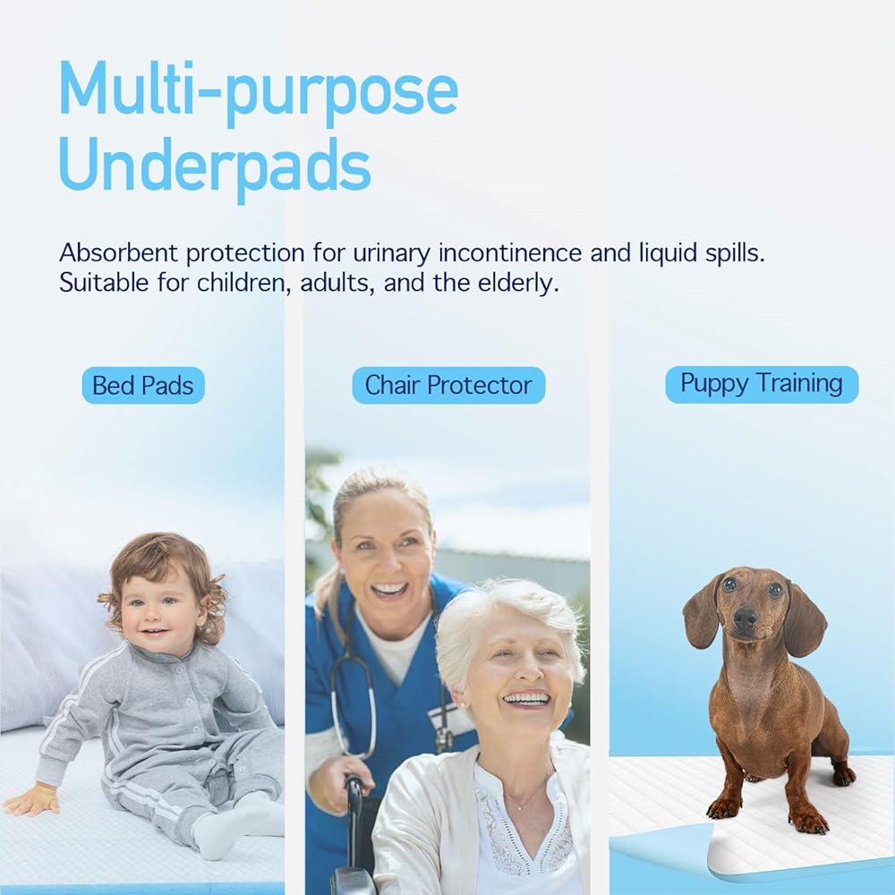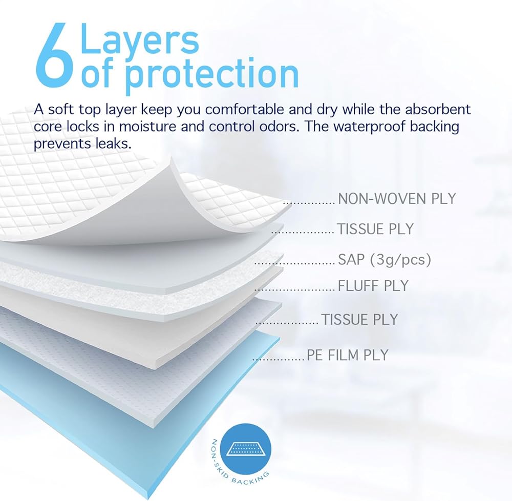 EXTRA ABSORBENCY AND PROTECTION: Our disposable bed pads for incontinence are filled with highly absorbent, soft fill and are sealed on four sides to prevent accidental leaks. The Underpads with Polymer offer extra absorbency and protection.