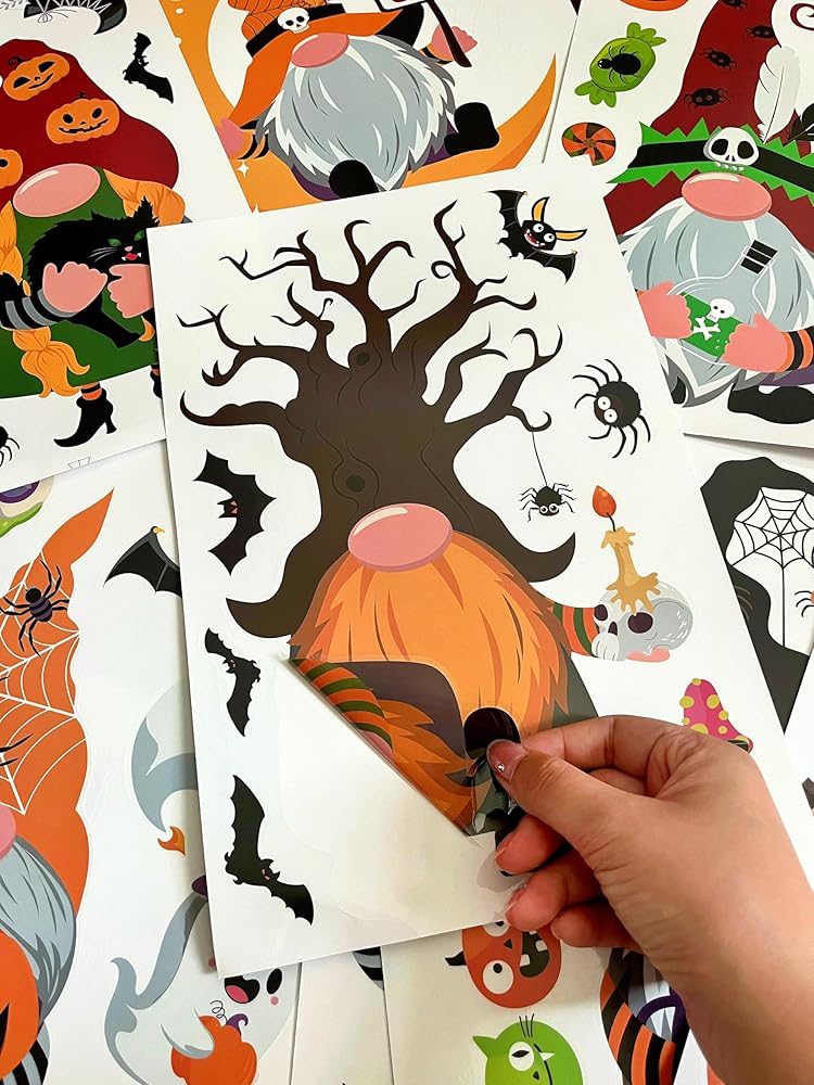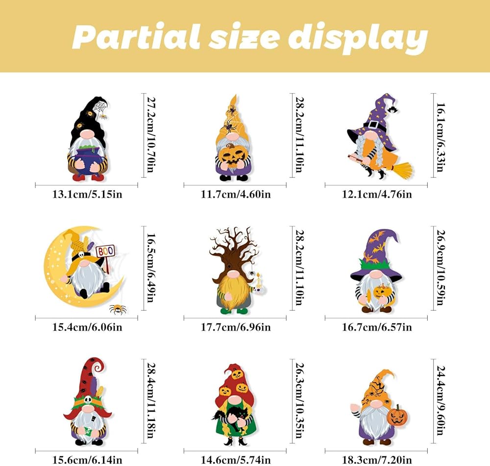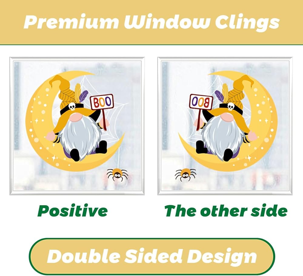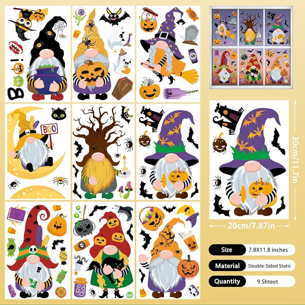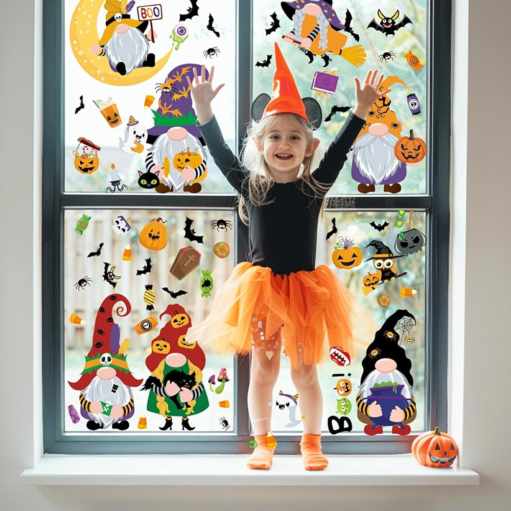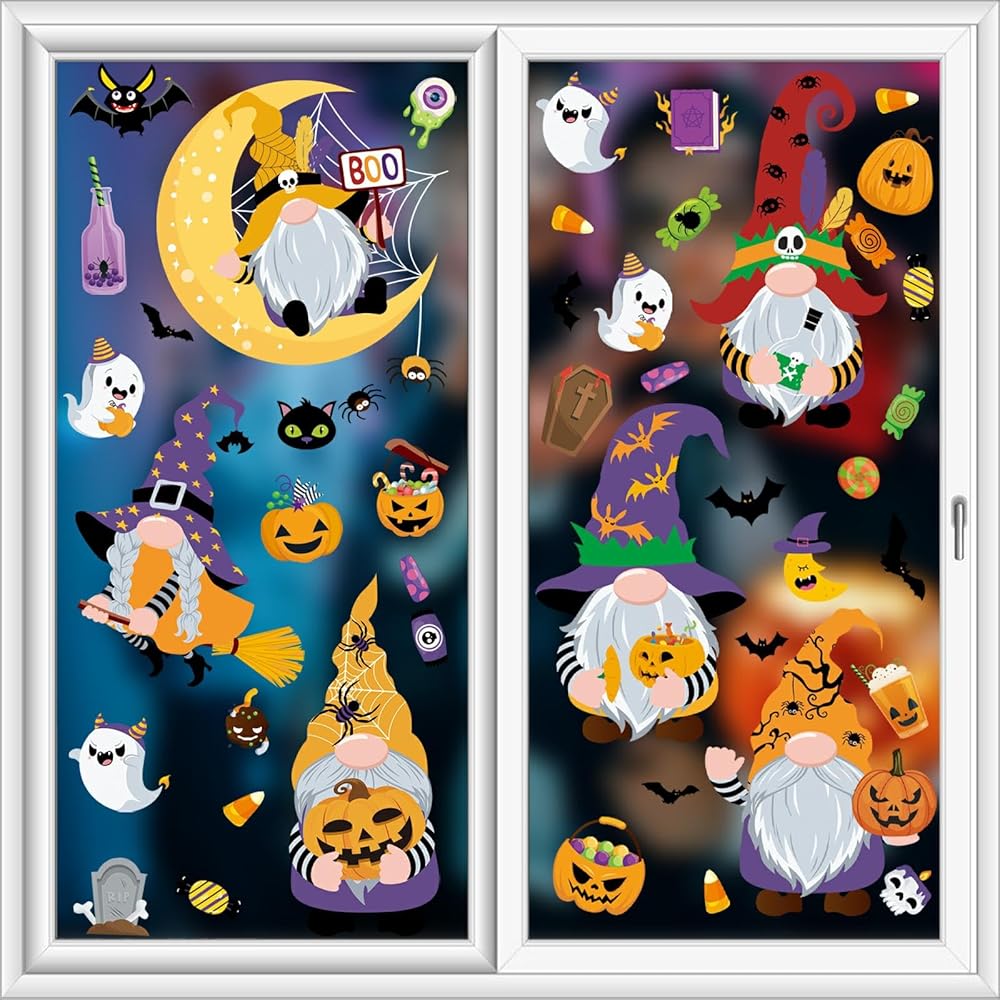 Unique Design: This Halloween window clings features an adorable Halloween gnome surrounded by playful elements like smiling pumpkins, friendly ghosts, cute bats, cartoonish spiders, and colorful candy