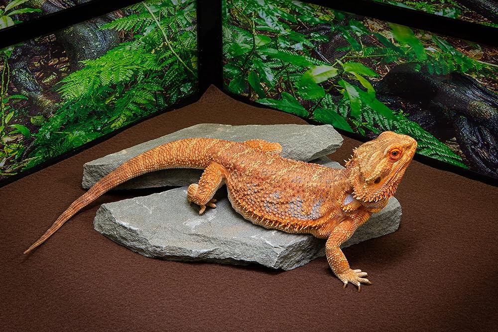 These Natural Habitat Rocks we have found to be an excellent choice for basking rocks, as well as for building habitat rock formations for various reptiles, amphibians and turtles. As a basking rock, there's enough natural porosity that although the rock gets warm accumulating heat, it doesn't get too hot; as glazed ceramic tile or slate would. As an aesthetic element in the habitat, they offer a truly natural accessory piece which is also manageable to keep clean. Natural rock also provides a means for self-grooming of reptile claws. These are real rocks (not cast resin or coated Styrofoam) and each one is unique. Grouped by general size (medium or large) and color (Blue Green, Deep Maroon, Painted Desert, Uluru Red and Watarrka Rose). Hand selected to typically have at least one side basically flat. The medium sizes about 6” x 8” and large sizes about 7-1/4” x 12-5/8”. We scrub the Natural Habitat Rocks that we use periodically in hot water, with a brush reserved for that purpose, followed by chlorhexidine. Carolina Custom Cages is a division of Carolina Designer Dragons, Inc.