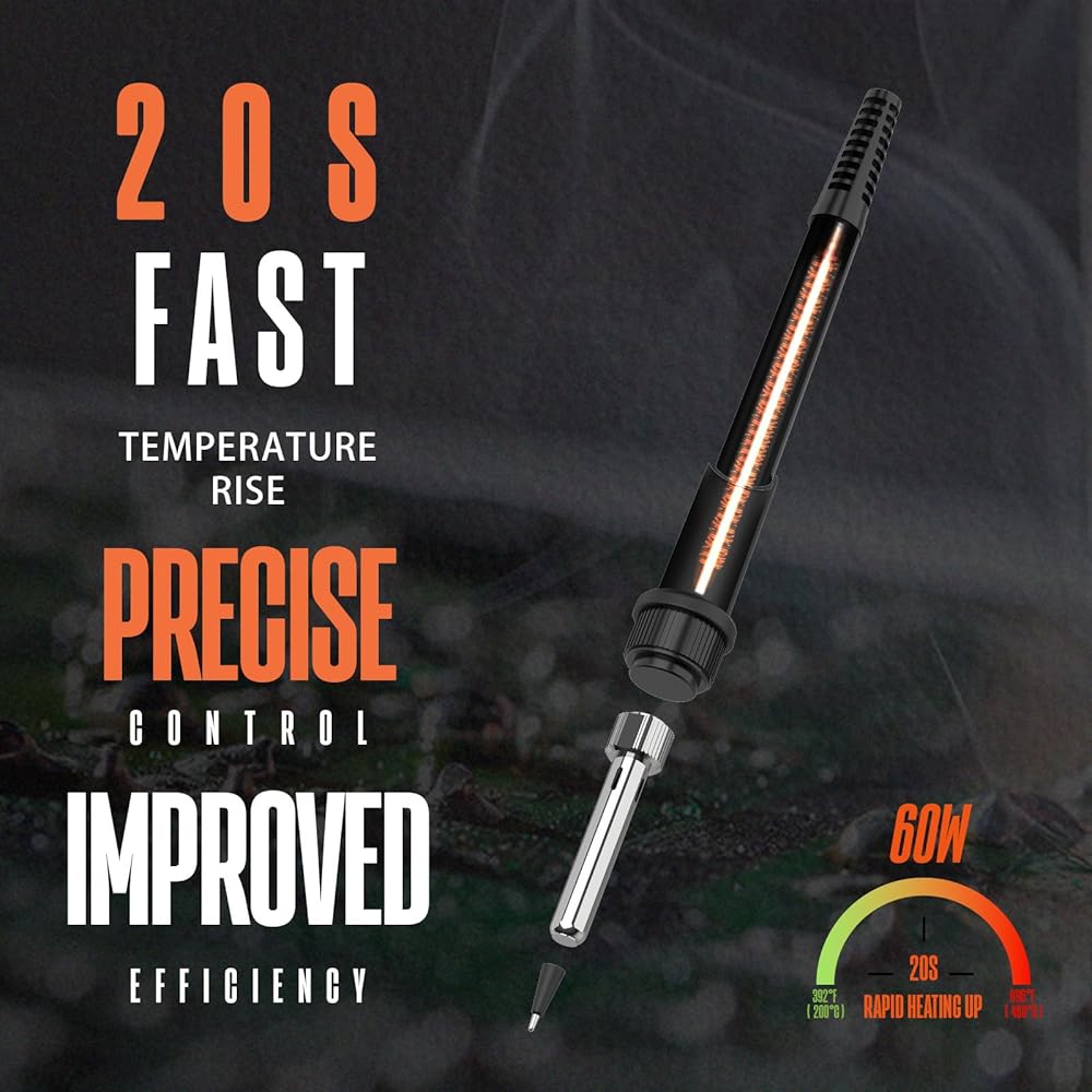 【𝟔𝟎𝐢𝐧𝐜𝐡 𝐂𝐨𝐫𝐝 𝐚𝐧𝐝 𝐒𝐢𝐥𝐢𝐜𝐨𝐧𝐞 𝐈𝐧𝐬𝐮𝐥𝐚𝐭𝐢𝐨𝐧 𝐏𝐫𝐨𝐭𝐞𝐜𝐭𝐢𝐨𝐧】:Elevate your soldering sessions with our soldering station kit! It includes a silicone-coated pen for heat insulation, guarding against burns, and anti-static protection for your sensitive electronics. The 60inch(1.5m)extended cord breaks down workspace limitations, offering beginners ample mobility and creative freedom. A dependable solution tailored to enhance your soldering skills, without compromising on quality or safety.