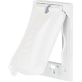 Flip cover ideal for outdoor electrical boxes. Constructed of heavy-duty die-cast metal with premium powder coat finish for durability. Features patented Quick-Fit keyhole mounting system for installation in under a minute. Pre-configured for GFCI (ground fault circuit interrupter) with patented Knock-Out technology for alternate devices. Includes gasket, mounting hardware, lockable tab, spring hinge closure, and adapter plate for 12-in-1 possible configurations.