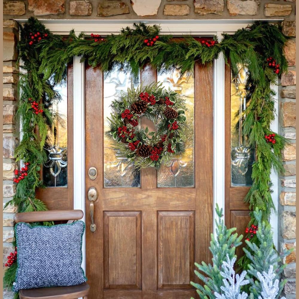 Add an elegant touch to your home this holiday season with our 24-Inch Gold & Champagne Christmas Wreath. Made with lush artificial holly leaves, eucalyptus, and shimmering gold berries, this wreath offers a luxurious and festive decoration for any setting. The warm tones of gold and champagne blend perfectly to create a refined and eye-catching Christmas wreath for front door, suitable for both indoor and outdoor Christmas decor. Perfect for both indoor and outdoor use, this wreath is designed to withstand winter conditions, making it the ideal choice for holiday door decor, Christmas wall hanging, or as a centerpiece. The durable materials and rich detailing ensure this Christmas garland wreath lasts for many holiday seasons, spreading cheer year after year. Its generous size and intricate craftsmanship make it perfect for anyone looking for a statement holiday wreath or a sophisticated artificial Christmas decoration. Ideal for holiday decor, front door wreath, Christmas decorations, or as a centerpiece for your holiday table, this wreath will be the highlight of your seasonal setup. Add a touch of winter magic to your home with our easy-to-hang, durable design, crafted to last for many holiday seasons to come. Features: Material: Artificial Holly leaves, Eucalyptus, Gold Berries. Color: Gold & Champagne. Size: 24 inches. Uses: Front door wreath, indoor & outdoor Christmas decor, holiday wreath, artificial Christmas garland, winter door decor.