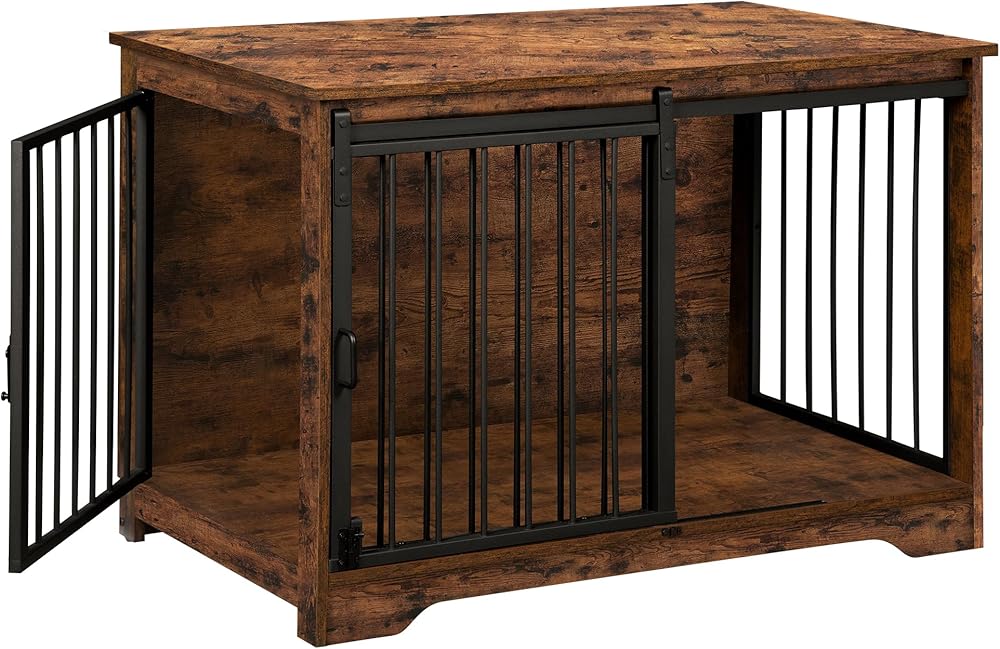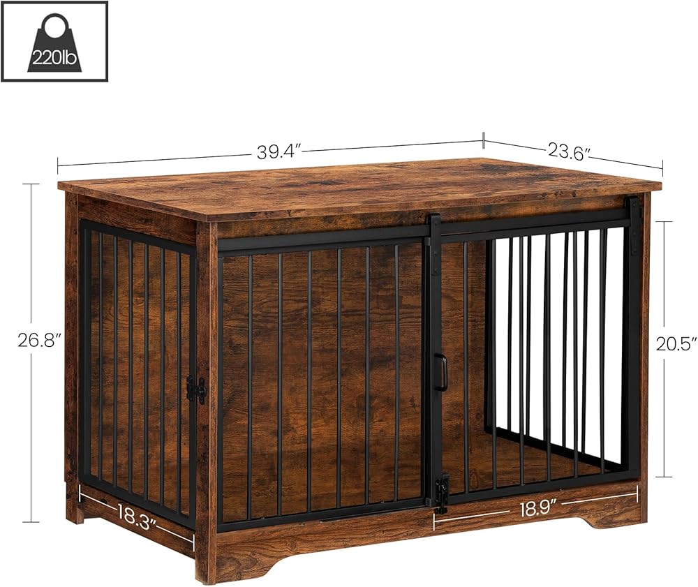 Hzuaneri Dog Crate Furniture, 39.4" Heavy Duty Dog Kennels with Sliding Barn Door, End Side Table, Wooden Dog House for Small/Medium/Large Dog, Chew-Resistant, Rustic Brown and Black DFC02301B