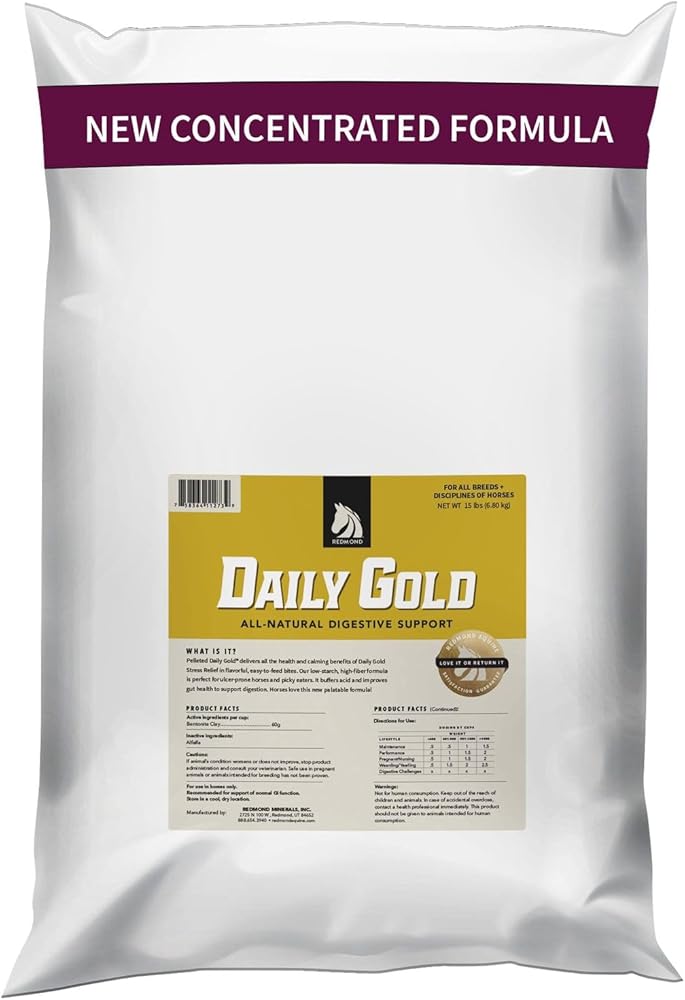 DIGESTIVE SUPPORT: Keep your horseâs gut steady during every season! Daily Gold buffers acid, binds toxins, eliminates diarrhea, and promotes healthy gut microbiome and nutrient absorption.