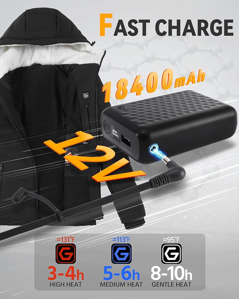 Powerful 12V 18400mAh Battery: Stay warm longer with our high-capacity power bank. Perfect for extended outdoor adventures, it ensures hours of uninterrupted heat without the worry of running out of power or constantly switching batteries.