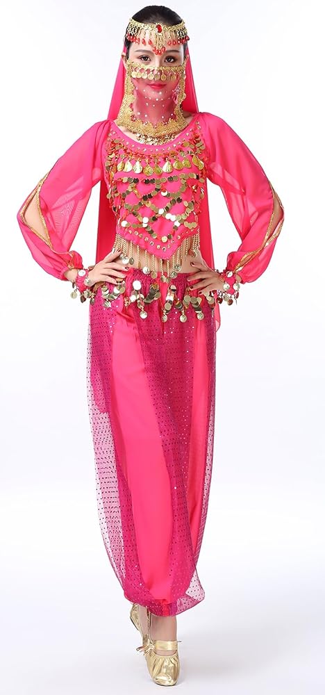 5 Pieces Outfits Includes: 1 x Short Sleeve Crop Top + 1 x Pleated Harem Pants + 1 x Belly Dance Hip Waist Chain with Coins + 1 x Head Chain + 1 x Belly Dancer Veil.