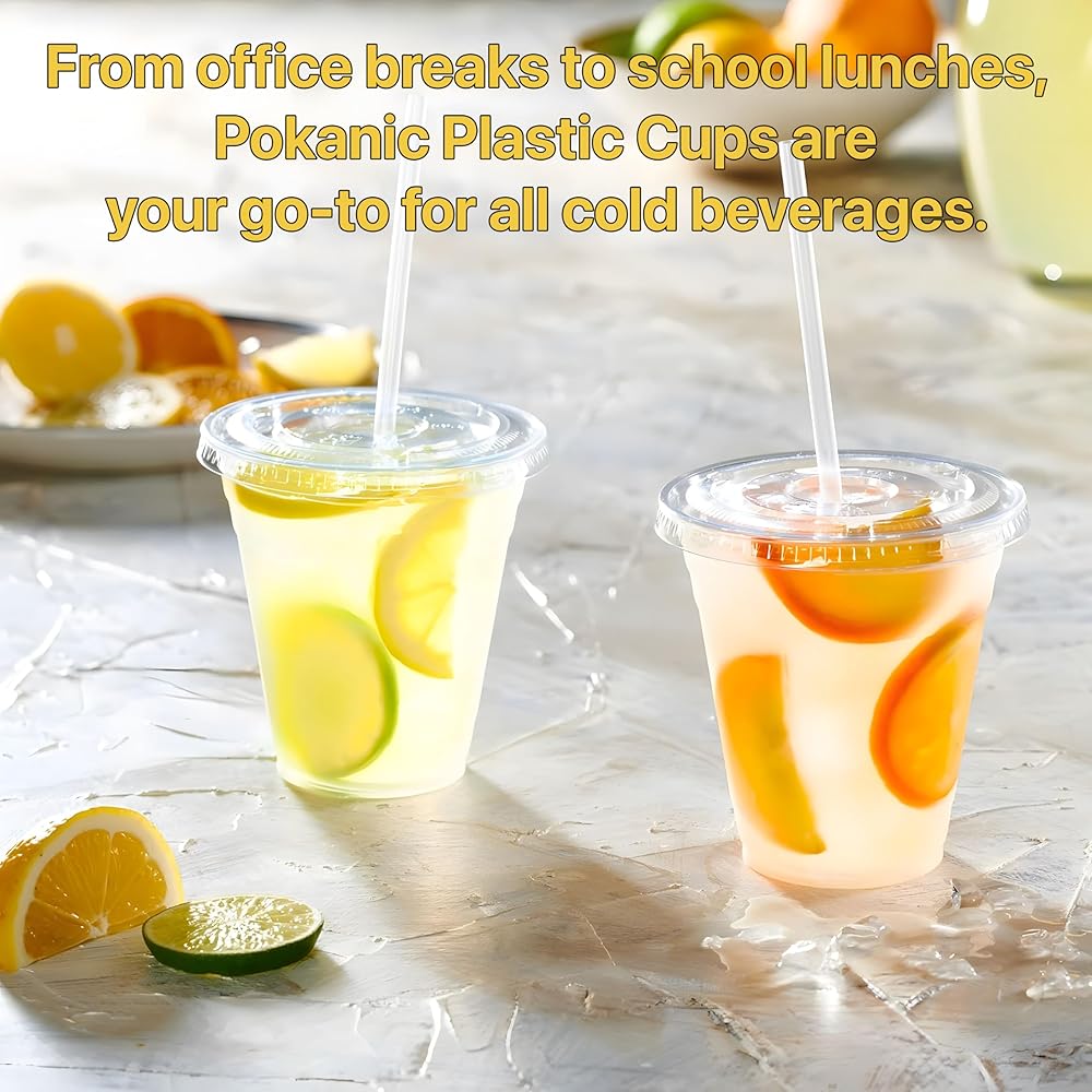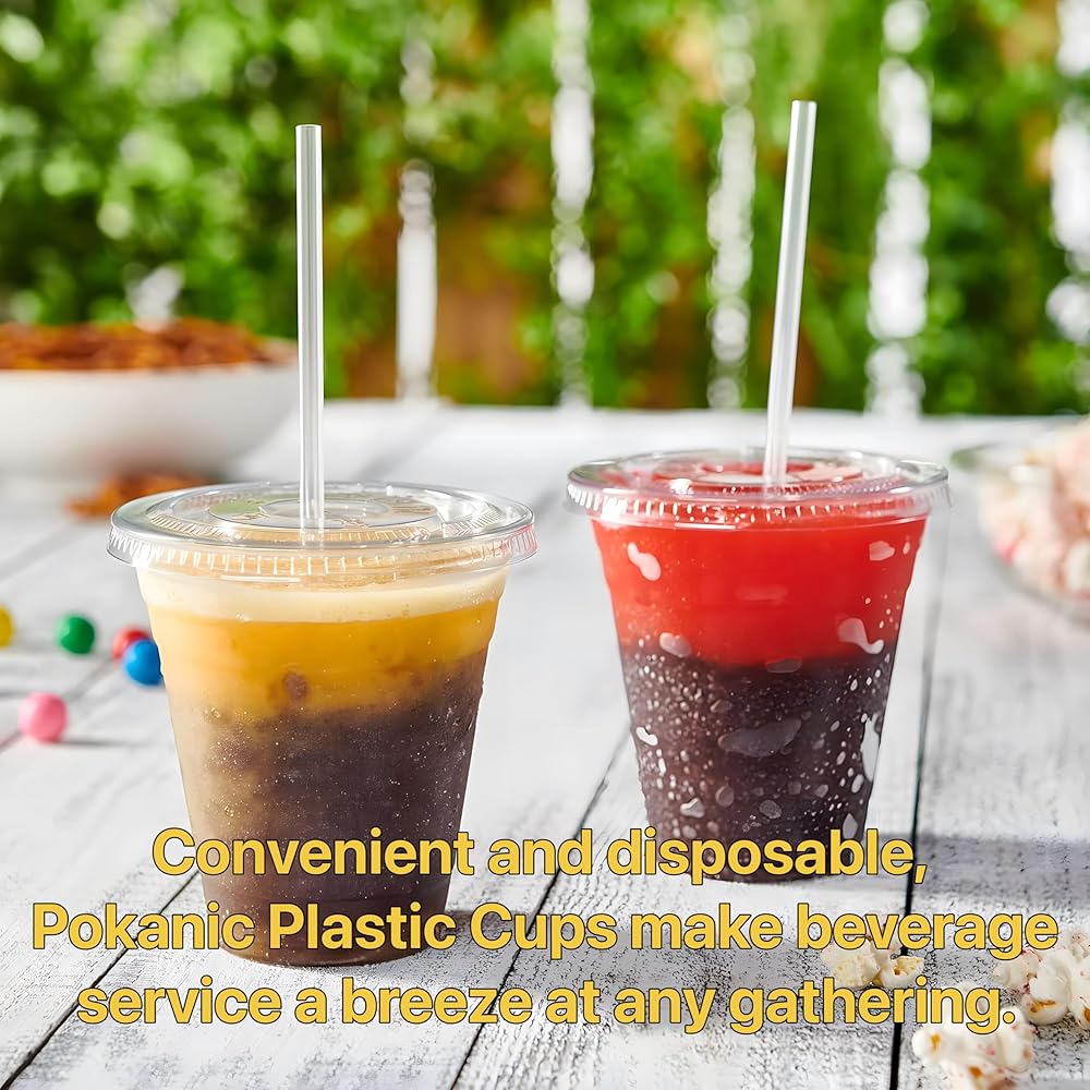 Experience convenience and style with Pokanic Plastic Cups. Perfectly crafted for any occasion, this pack includes sturdy cups with secure lids and vibrant straws, ensuring a spill-free experience every time. Ideal for serving cold beverages like iced coffee, water, juice, or tea, these disposable cups are versatile for parties, travel, events, cafes, restaurants, schools, offices, and home kitchens. Enjoy refreshing drinks with ease and elegance with Pokanic Paper Plastic Cups, your go-to choice for both practicality and aesthetics.