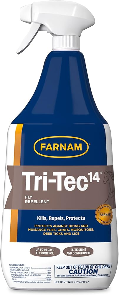 Kills, repels, and protects! Farnam Tri-Tec 14 Fly Repellent is a water-based horse fly spray formula that means business. Protect your horse against six types of biting and nuisance flies plus gnats, mosquitoes, lice, and deer ticks. Tri-Tec 14 horse fly spray delivers quick knockdown and long-lasting protection. Keeps working for up to 14 days. Read the label for application directions to get the most out of this hard-working fly spray for horses. Tri-Tec 14 contains multiple active ingredients including Cypermethrin, Pyrethrins, Piperonyl Butoxide, Technical, and Butoxypolypropylene Glycol. It is available in a 32-ounce ready-to-use trigger spray bottle, 128 ounces economical Easy Pour spout gallon refill and a 15-ounce non-aerosol 360-degree continuous spray can for complete coverage from every angle that you choose to spray. Farnam Tri-Tec 14 Fly Repellent is a powerful weapon and your best defense in the war on biting and nuisance insect pests. Flies are an inevitable fact of horse ownership, but your horse doesn't have to be stomping and swishing his tail non-stop during the fly season when you use Tri-Tec 14 Fly Repellent. Bugs don't fly with Farnam, your partner in horse care.