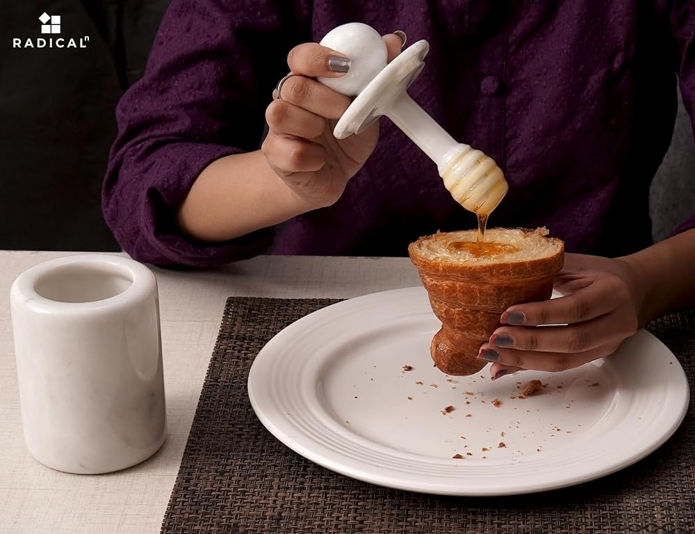 Radicaln Marble Honey Pot 5.5'' Inches White Handmade Honey Jar with Dipper and Lid - Honey Dispenser For Kitchen Tabletop, Mini Honey Jars For Countertop Storage