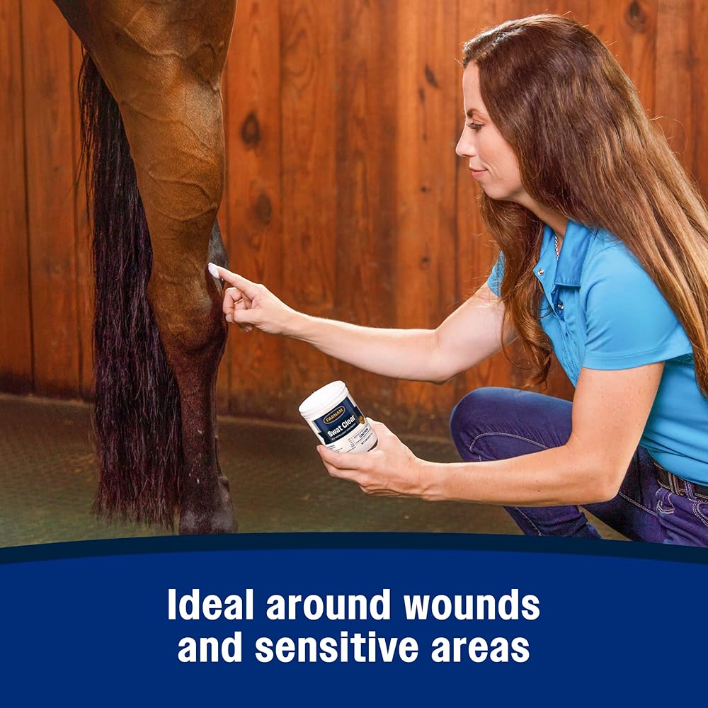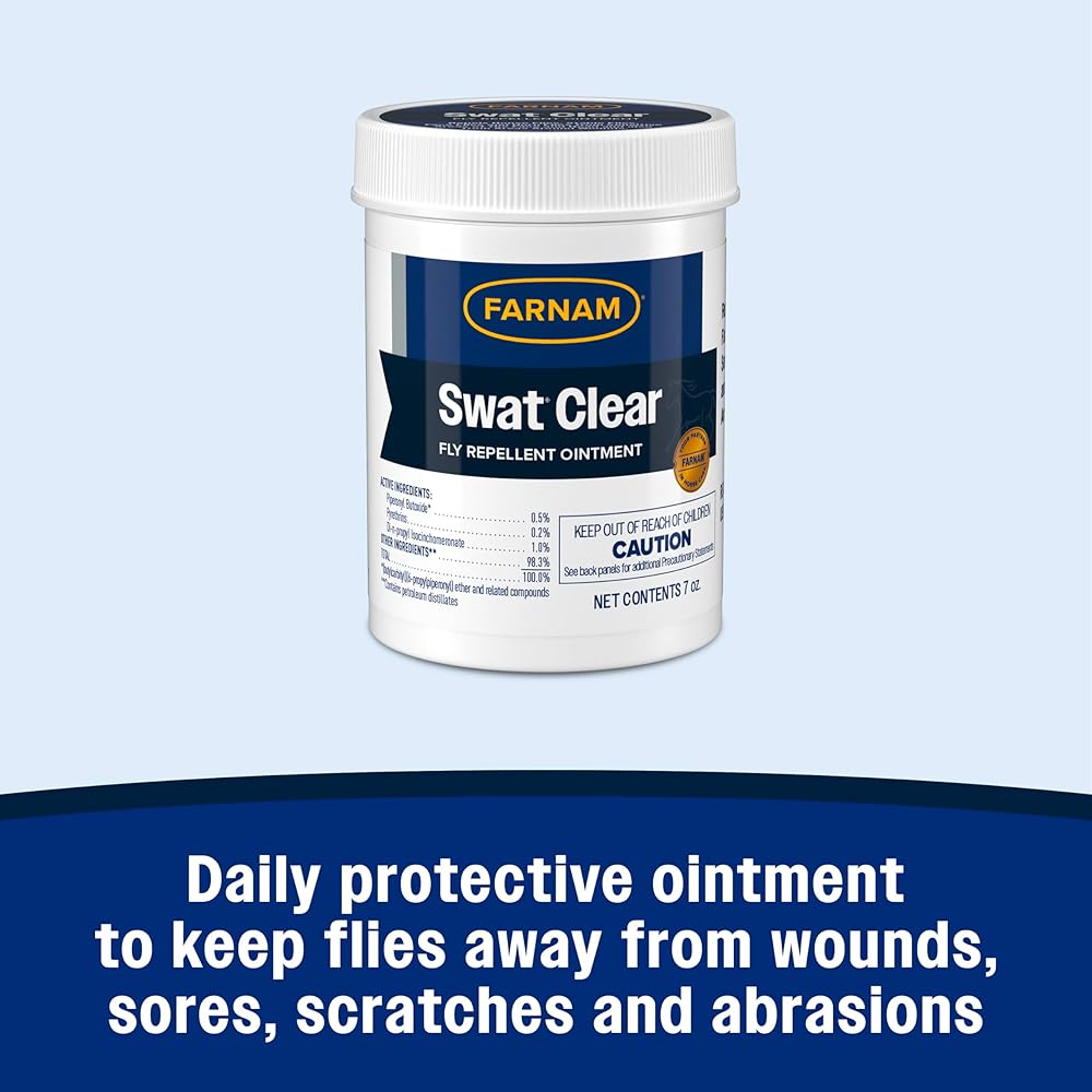 When it comes to protecting your horse from flies, be prepared for every situation! Horse owners know it takes more than a few different tricks and products to maintain a true No Fly Zone. That's why SWAT Fly Repellent Ointment is an essential part of every fly control solutions team. This ointment plays the special role in your tack box of targeting and protecting some of the most sensitive and hard-to-reach areas of your horse. The hardworking formula is ideal for use around wounds, sores, scratches and abrasions, as well as the eyes and ears, to keep those pesky flies away. Don't be fooled by the small package, a little bit of SWAT Fly Repellent Ointment goes a long way and doubles as part of your wound care supplies. The handy 7-ounce jar is easy to store and just as easy to take with you on the go, so you can be prepared whenever flies show up. Apply it daily for effective fly repellent against house, stable, face and horn flies. SWAT Fly Repellent Ointment is available in the original pink color (to help identify and locate wounds) and a clear formula (for the more discreet times, like in the show pen). It works great on dogs too! Don't be caught (or leave home) without this essential member of your No Fly Zone team. Farnam, your partner in horse care.