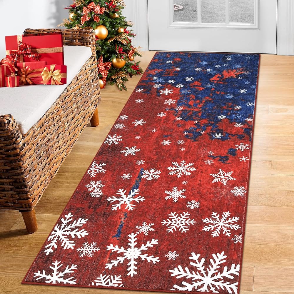 . Non-slip backing helps the rug stays in place well. Machine made low pile is easy to clean, pet friendly, stands up to active lifestyle.Perfect Placement in Any Room: This soft rug offers exquisite printed texture on a soft-underfoot polyester base. The chic Christmas design makes an attractive addition to any décor. This versatile area rug features a stylish color scheme and a bold, eye-catching pattern that will effortlessly complement any décor. Perfect for Dining Room, Living Room, Bedroom. Lightweight and low profile. No Additional Rug Pad Needed.