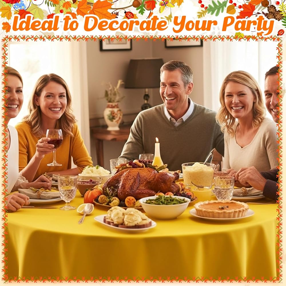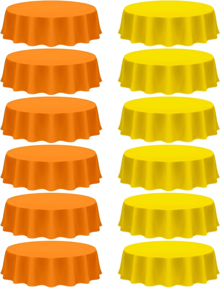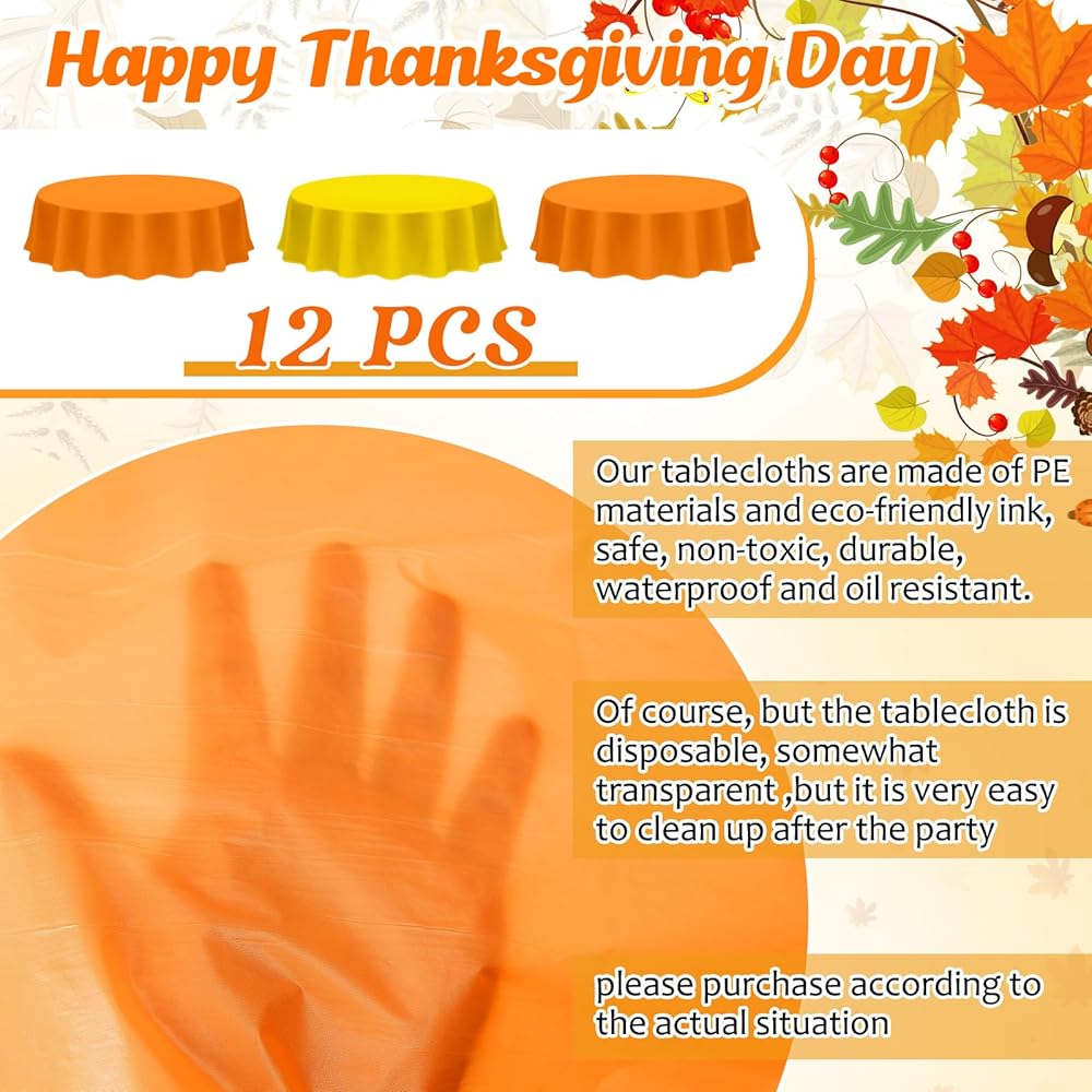 Abundance for Your Thanksgiving Decorations: with a generous package of 6 round plastic tablecloths in warm autumn shades of orange and yellow, you will have enough to adorn most tables at your festive Thanksgiving gathering