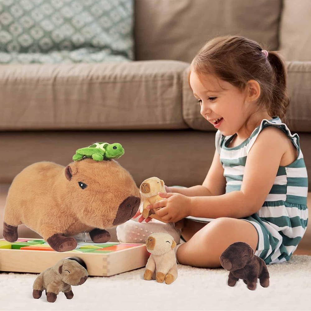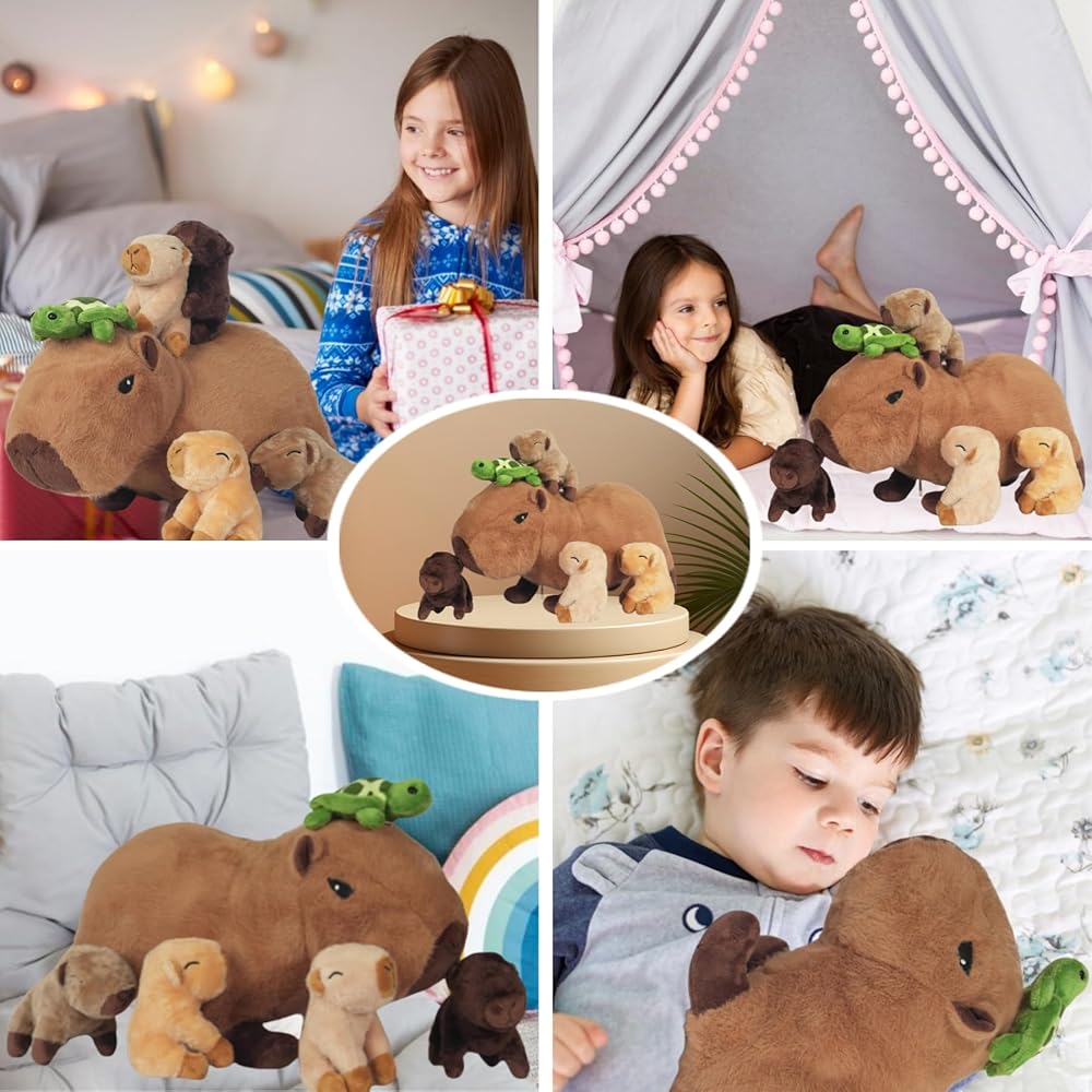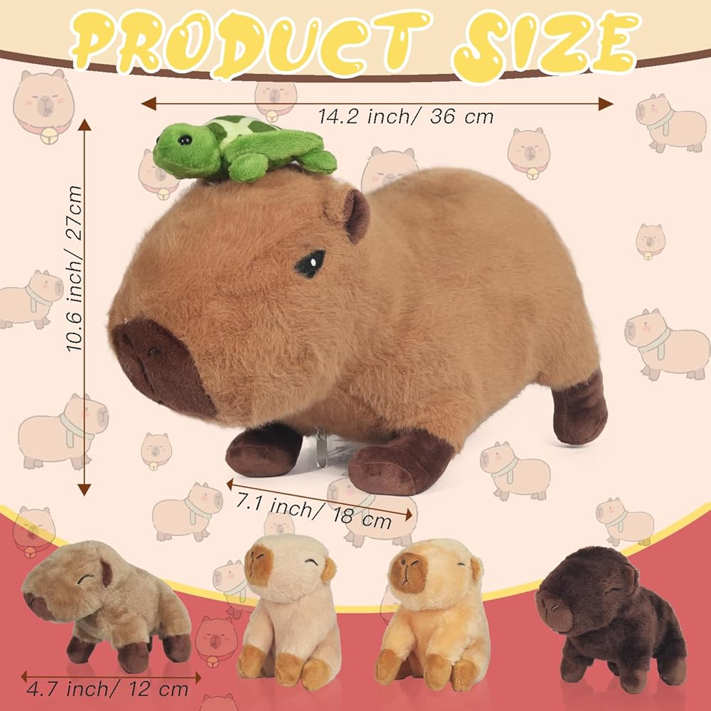 【5 Pcs Cute Capybara Plush Set】: You will get a mommy capybara stuffed animal with turtle and 4 small baby capybara in different colors. The big stuffed animal capybara is about 14.2 inches long and the 4 babies are about 4.7 inches long.
