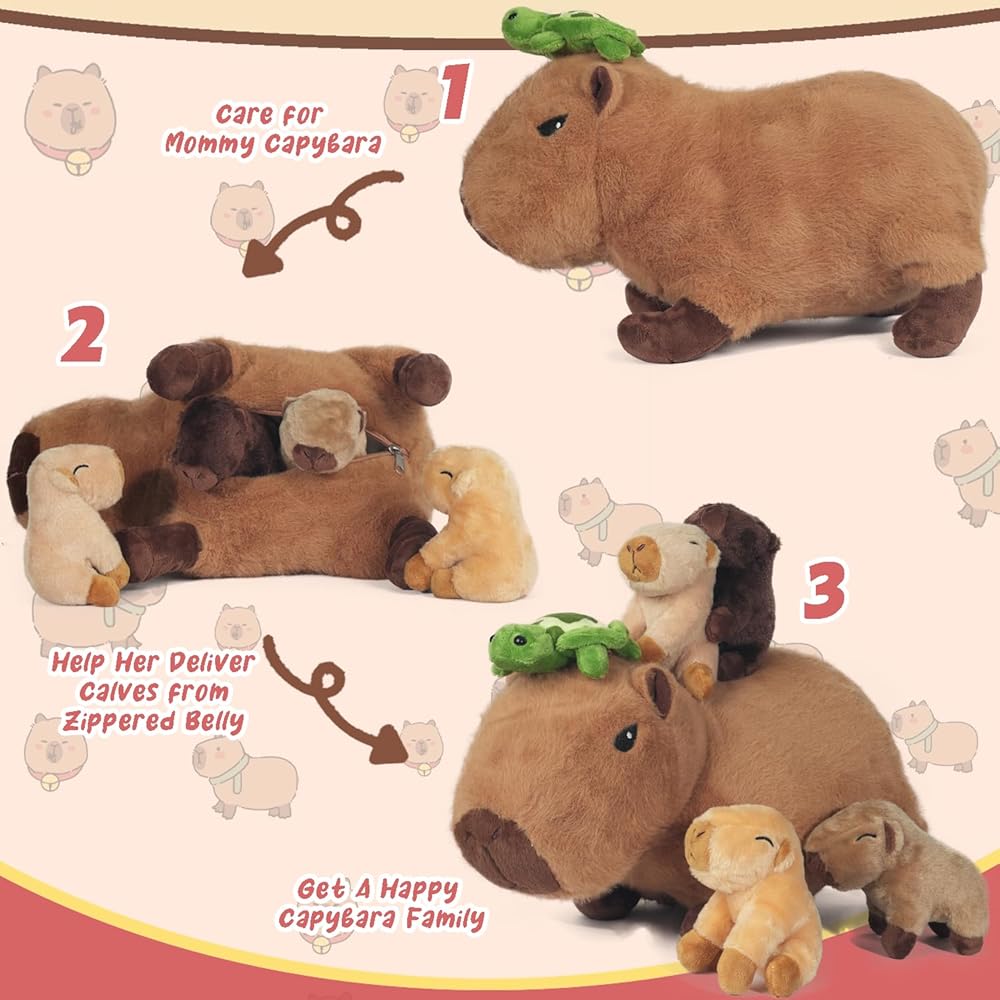 【Zipper Design】: Soft stuffed animal capybara plushie has a surprise in her tummy. When kids open the zipper, they will be surprised to find four cute baby capybara inside. The zipper design makes the capybara toy easier to carry and store without taking up too much space.
