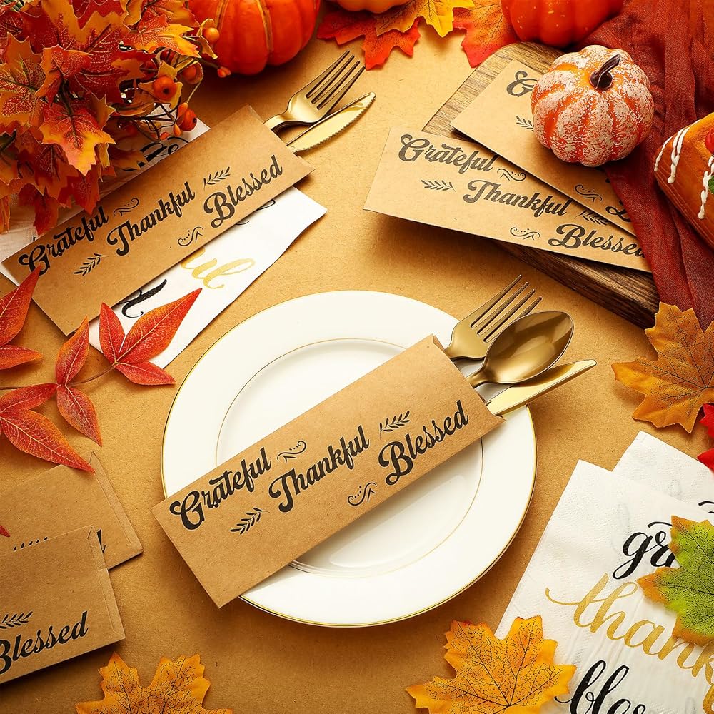 Decorate your Thanksgiving table with our "Thankful Grateful Blessed" Thanksgiving silverware holder and Thanksgiving dessert napkins. Easy to clean up, this set is an ideal gift for most occasion.