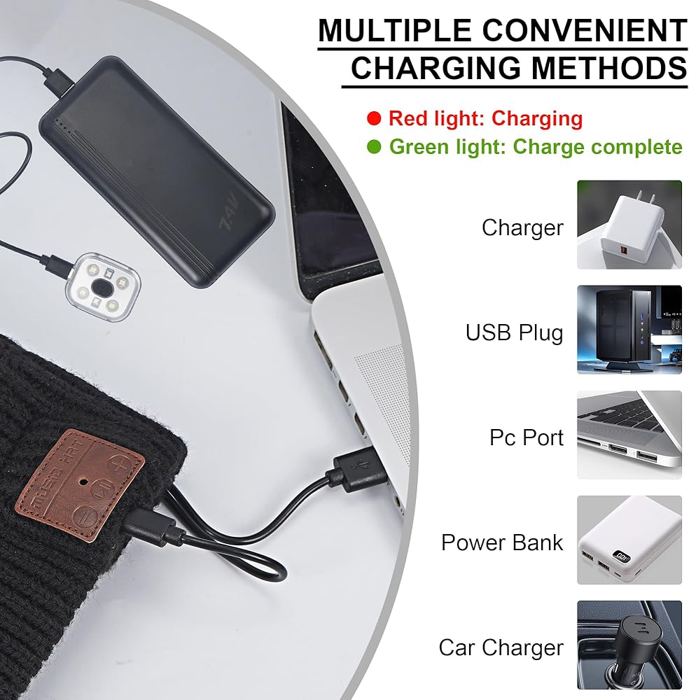 【LONG LASTING PERFORMANCE】The led beanie with headphones has a built-in rechargeable 300mAh LiPO battery, which can be charged for 1.5-2 hours via the included USB cable via laptop, power bank, socket, car charger, etc. The LED light and speaker can be charged separately for 12+ hours, providing more than 12 hours of music or more than 24 hours of talk time, 3-9 hours of light time, and 350 hours of standby time. No more tangled wires, easily enjoy hands-free music, calls, lighting and SOS.