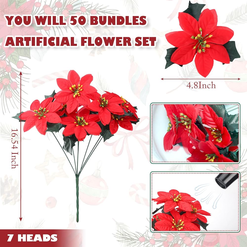 Christmas Artificial Poinsettia Set: you will get 50 bunches of poinsettia flowers, each has 7 heads, about 16.54 inches/ 42 cm long, sufficient quantity makes this Christmas a truly beautiful holiday