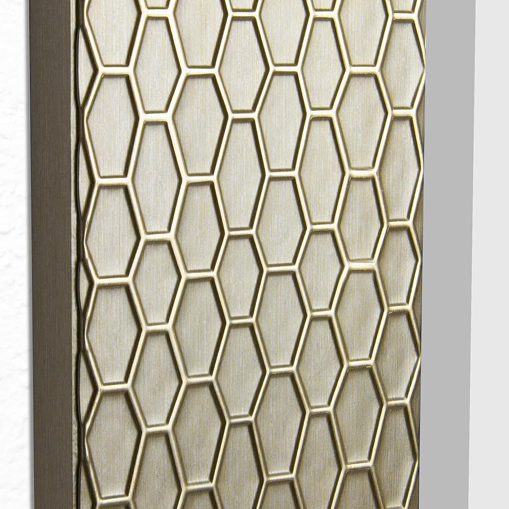 Geometric shapes have become a huge trend in the last decade. Shapes of all sorts are an easy way for professional designers and homeowners to add texture, interest, and variety to their decor, and this elegant honeycomb beveled mirror is no exception This premium quality mirror is comprised of a champagne-colored polystyrene frame that's textured with a repeating honeycomb pattern. Inside this unique frame sits a genuine crystal mirror with bevel. This slightly angled edge gives the mirror a polished look while also providing you with a little bit of sparkle when the light hits it just right. Each mirror comes specially fitted with four D-ring hangers, allowing you to hang your new piece vertically or horizontally, giving you ultimate freedom in placement and room design.
