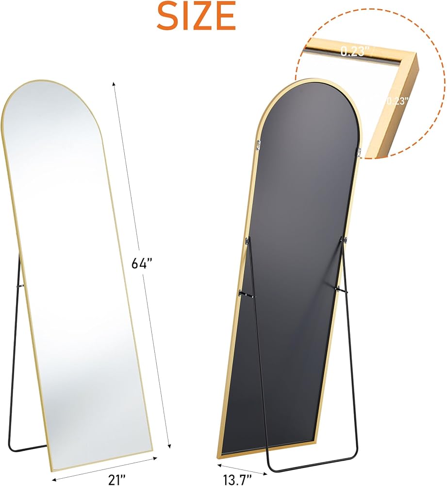 【Unique Design】 The top of the floor mirror adopts a unique smooth arched top frame design, which adds beauty on the basis of practicality. The slim aluminium frame adds a touch of design to the body mirror, allowing him to become an ornament for your space.