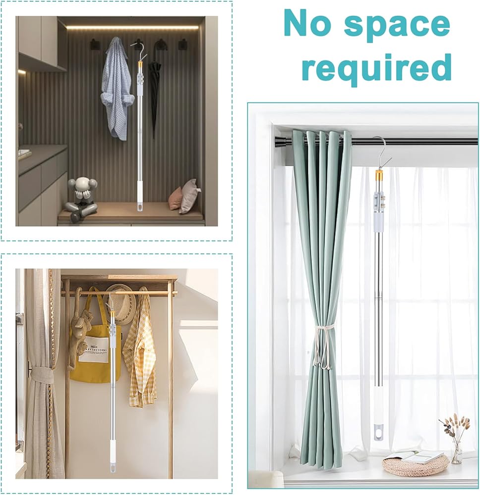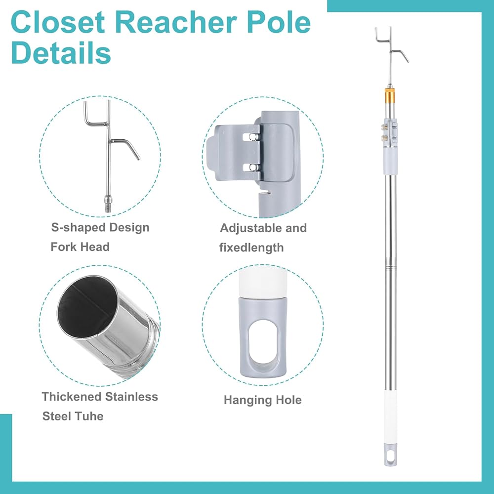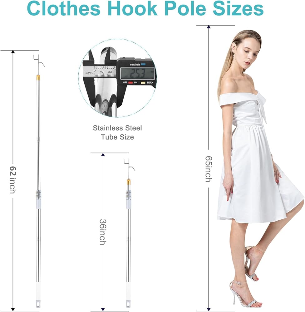 【High Quality Materials】: The high reach garment pole is made of high-quality stainless steel and is equipped with high-quality stainless steel hooks; High quality, durable, and rust proof; We provide you with better and more durable adjustable telescopic rod hooks.