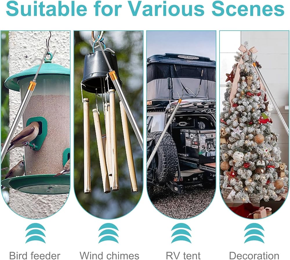 【Widely Applicable Scenarios】: The clothes hooks pole can be used to hang clothes on high hangers or Christmas light poles, hangers, high cabinets in the kitchen, high items in the living room, curtain rod hooks, clothes drying poles, flower pots, plants, or bird feeders. You no longer need to bend, reach out, or climb. There is also a sunshade that is easy to access for RVs, making it a great helper in daily life and a great companion for camping trips.