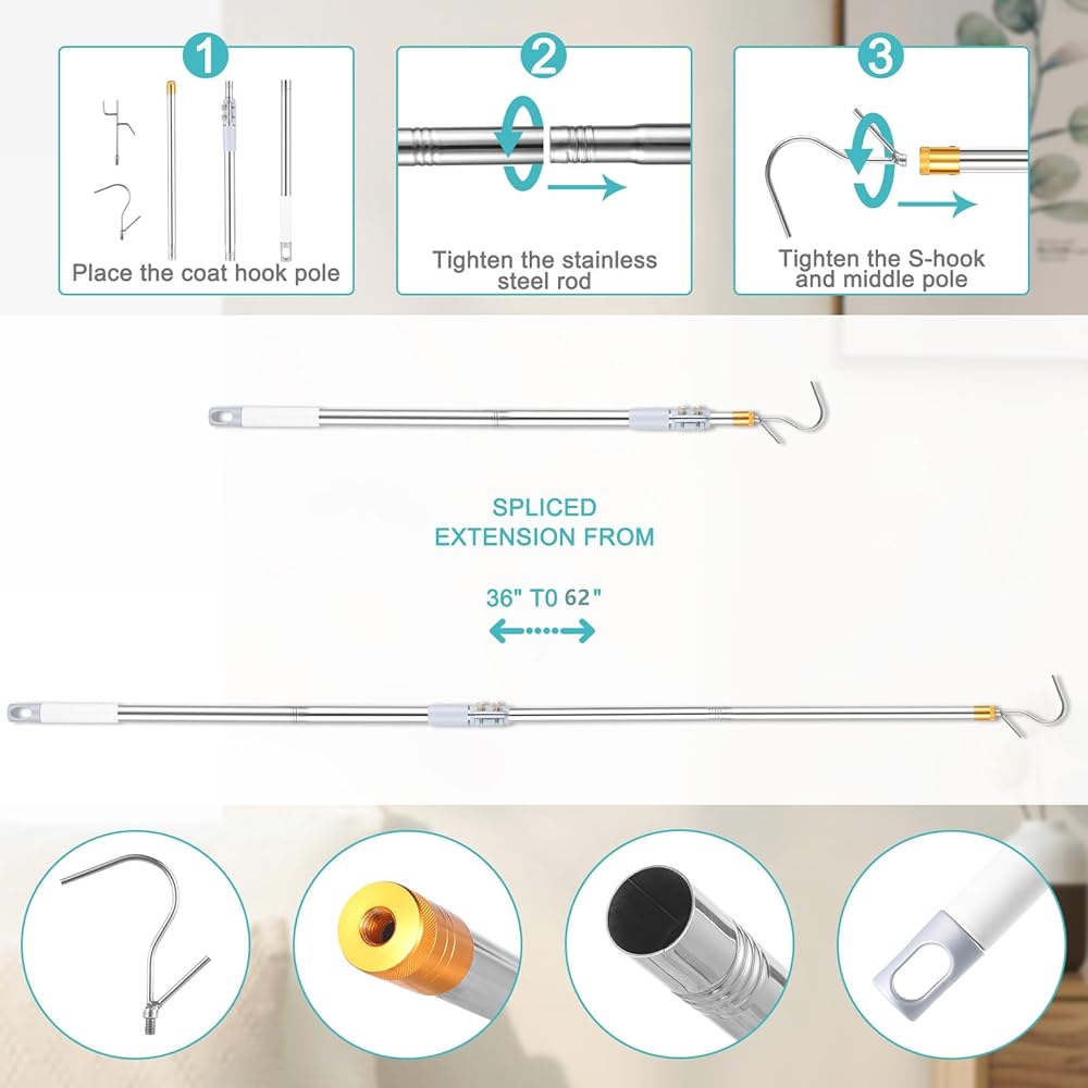 Clothes Hook Pole, 36" to 62" Long Pole Long Handle Telescoping Pole Stainless Steel Tube S Hook Closet for Reaching Extending Rod Lightweight Hang High Area Top(with 2 Hooks)