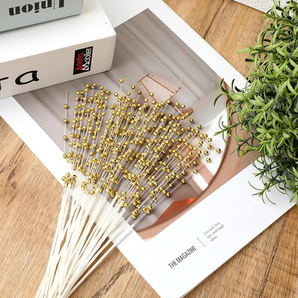 50 Pcs 4mm Pearls String Beaded Stick Pearl Bouquet Party Decoration Gold Floral Accents Bride Wedding Bouquet Accessories Long Sticks for Flower Golden Glitter Berry Stem Decorations for Party