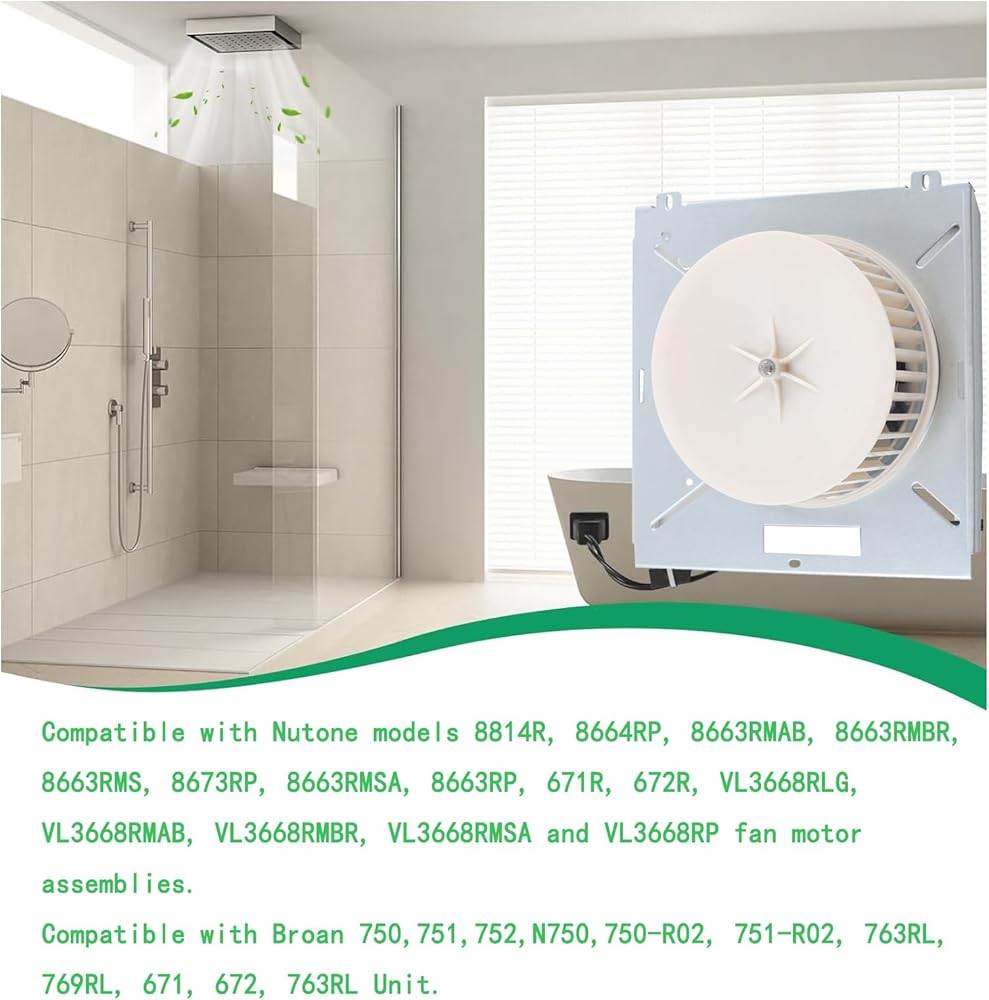 Compatible Models: Compatible with Nutone models 8814R, 8664RP, 8663RMAB, 8663RMBR, 8663RMS, 8673RP, 8663RMSA, 8663RP, 671R, 672R, VL3668RLG, VL3668RMAB, VL3668RMBR, VL3668RMSA and VL3668RP fan motor assemblies. Compatible with Broan 750,751,752,N750,750-R02, 751-R02, 763RL, 769RL, 671, 672, 763RL Unit