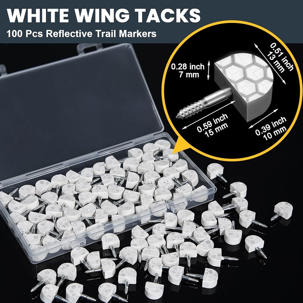 What You Will Get: 100 pieces of White and Orange reflective tacks, 50 of each color; This ample quantity ensures you have enough markers for extensive trails or multiple hiking trips; And they are packed in a plastic box, easy for you to store and carry, these are a practical tool for outdoor hunting enthusiasts