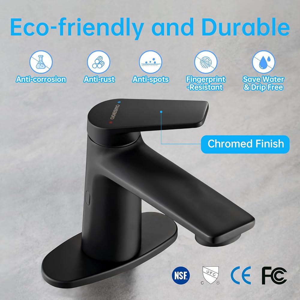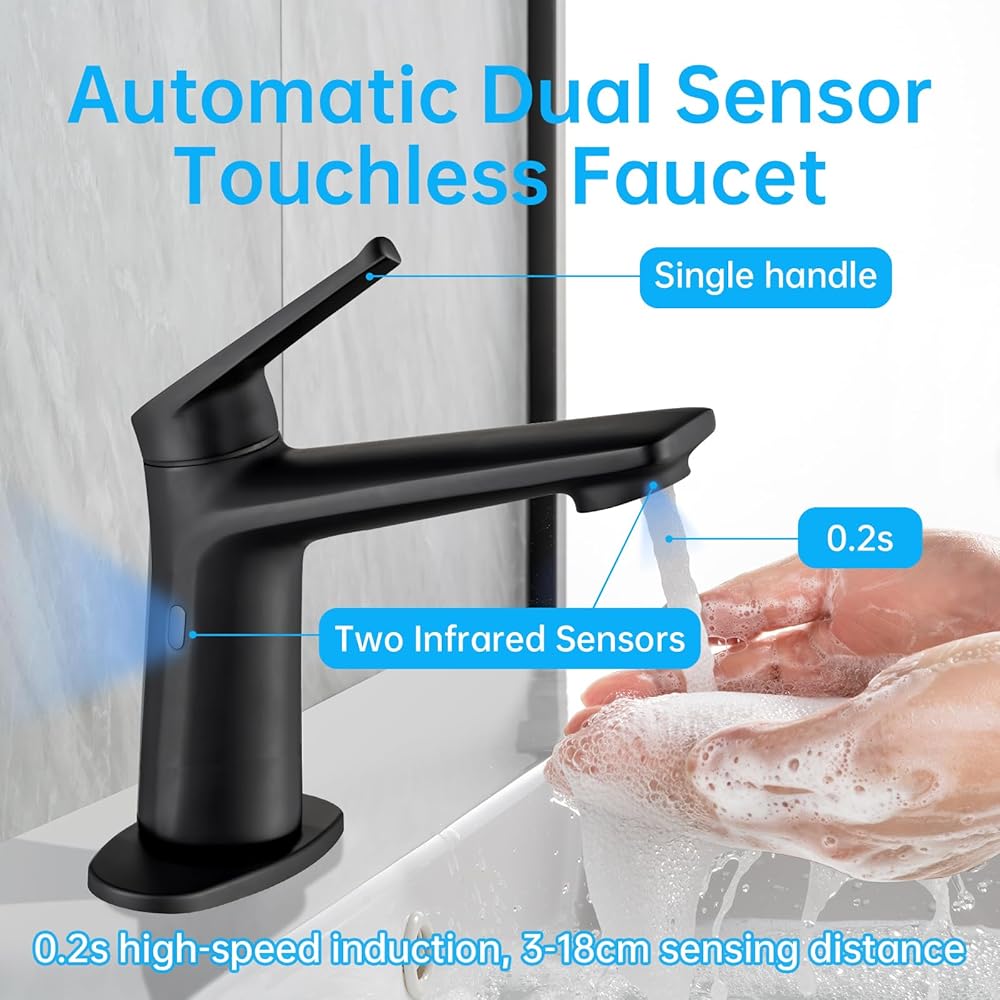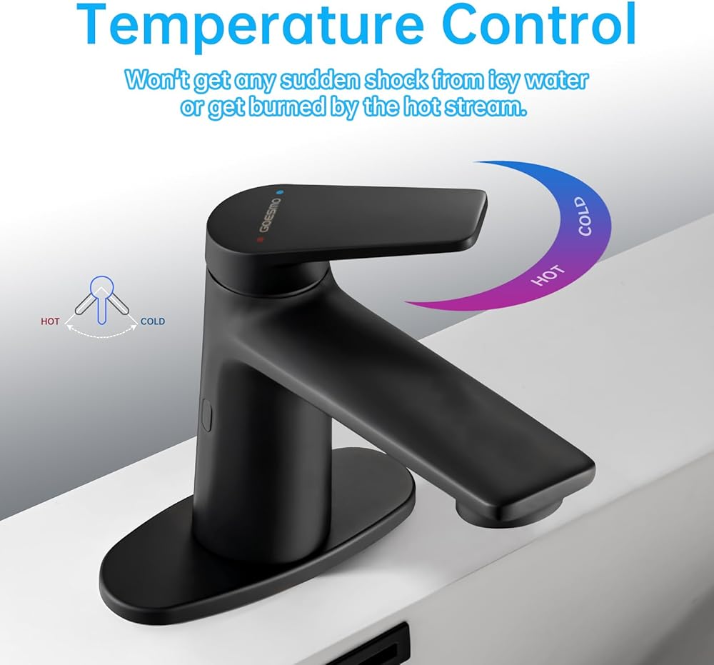 Manual Control: This sensor faucet bathroom with a hole cover integrates with the motion sensor and handles the control function. Turn the handle to switch on/off the water, and adjust the water temperature like a touch on bathroom sink faucets. GOESMO automatic sink faucet adopts a dual waterway design ensuring your daily water use won't be affected even without a battery and brings more convenience to your modern life.