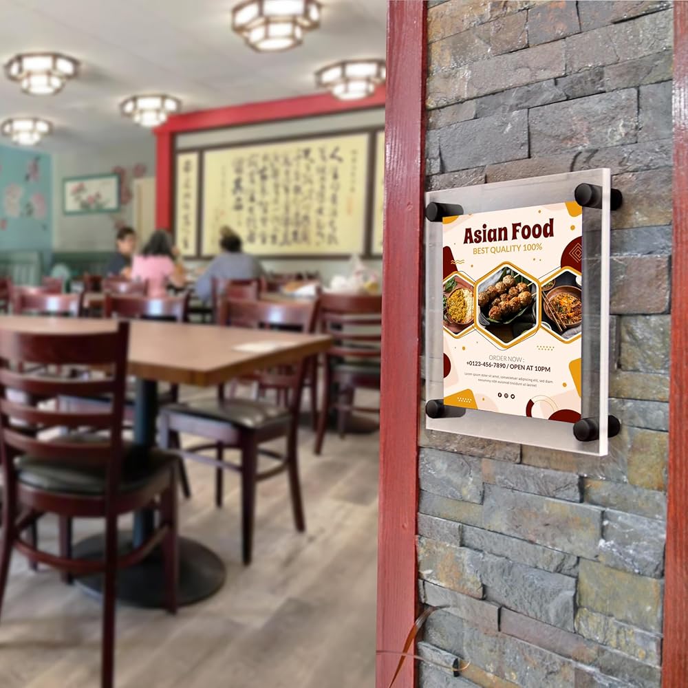 These classy one-sided Wall Mount Floating Frames are ideal for displaying artwork, photos, posters or branding in your office, home or at an event. These clear double panel floating frames with gold caps are strong, stable, as well as easy to clean and maintain. The innovative design holds your artwork or picture in place without it moving or slipping at all. Add elegance to your professional environment with Azar's clear acrylic gallery frames with gold satin aluminum caps and standoffs. Frames can be used vertically or horizontally. Each floating sign holder frame set includes 2 acrylic panels that are 3/16” thick, 4 gold standoff caps and hanging hardware. Note: Large format sizes: 24” x 36” and 30” x 40” include 6 standoffs and caps. Easy to change the sign or photo, simply unscrew the front gold cap and switch out the graphic. There is no need to remove the frame from the wall once it is affixed. The edges are flame polished giving these floating picture holders a high end finish with a touch of fancy. Hang these beautiful acrylic frames in boutiques, museums, trade shows, hotel lobbies, restaurants, retail stores, schools, at work or at home. Sold in Multiples of 1.