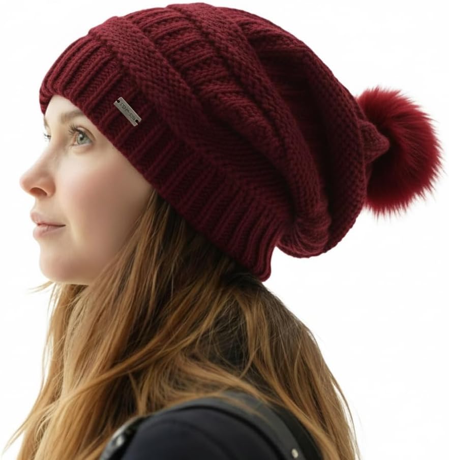 【Stylish Slouchy Design with Fluffy Faux Fur Pom Pom】: The upgraded slouchy style and durable faux fur pom pom make this beanie a trendy accessory that pairs well with any winter outfit. It's perfect for casual outings and makes for a chic yet functional piece of winter gear.