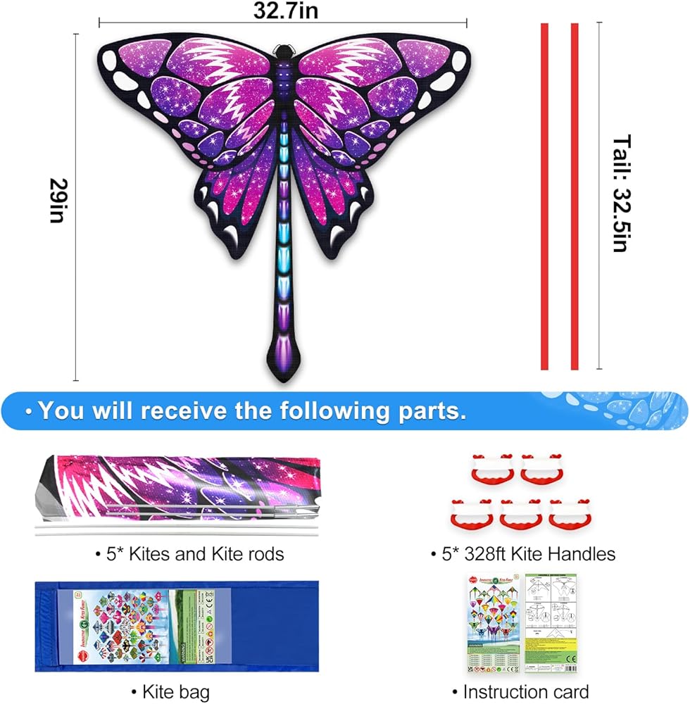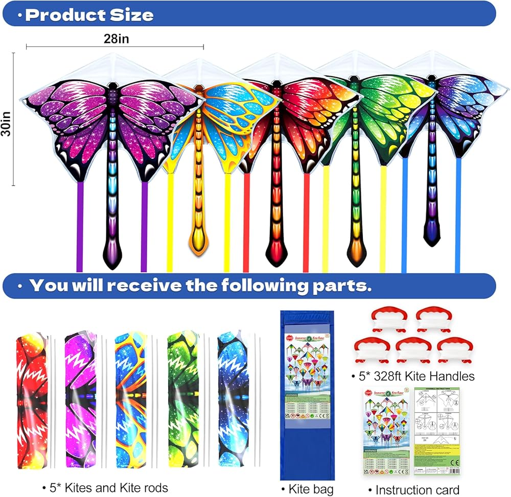 Great Gift for Outdoor Games: Large Butterfly Kite with Packing Bags! Includes Colorful butterfly Kites*5, kite accessories*5 with 100meter/328FT kite string and easy-grip handles and Assemble Instructions .It's fabulous spring summer holiday gift for kids boys and girls- amazing design unicorn kite, bat kite, butterfly kite etc.