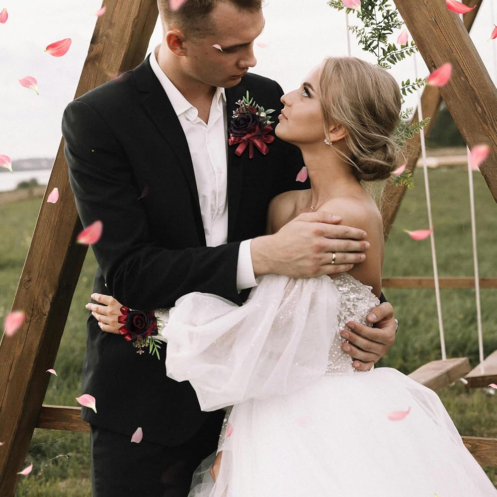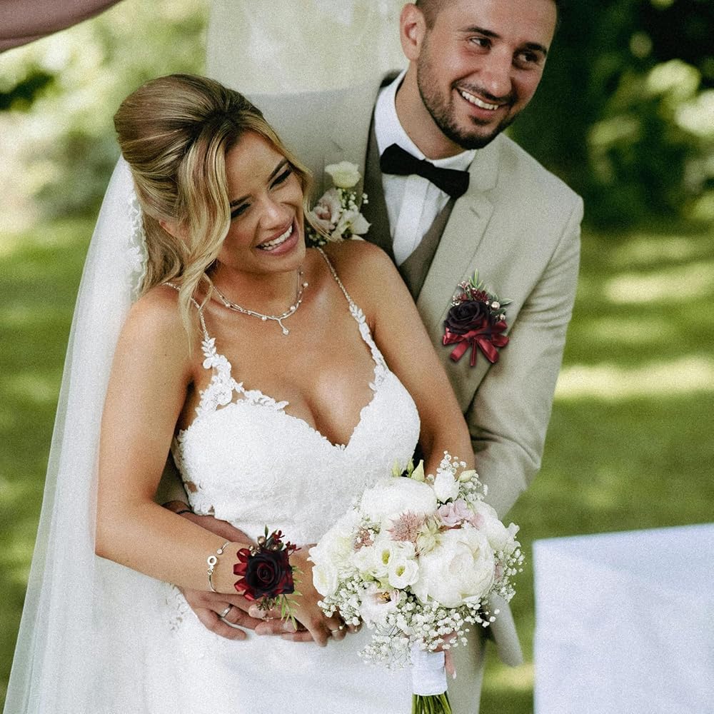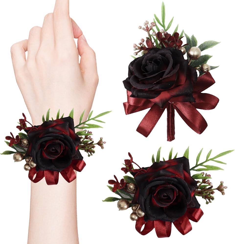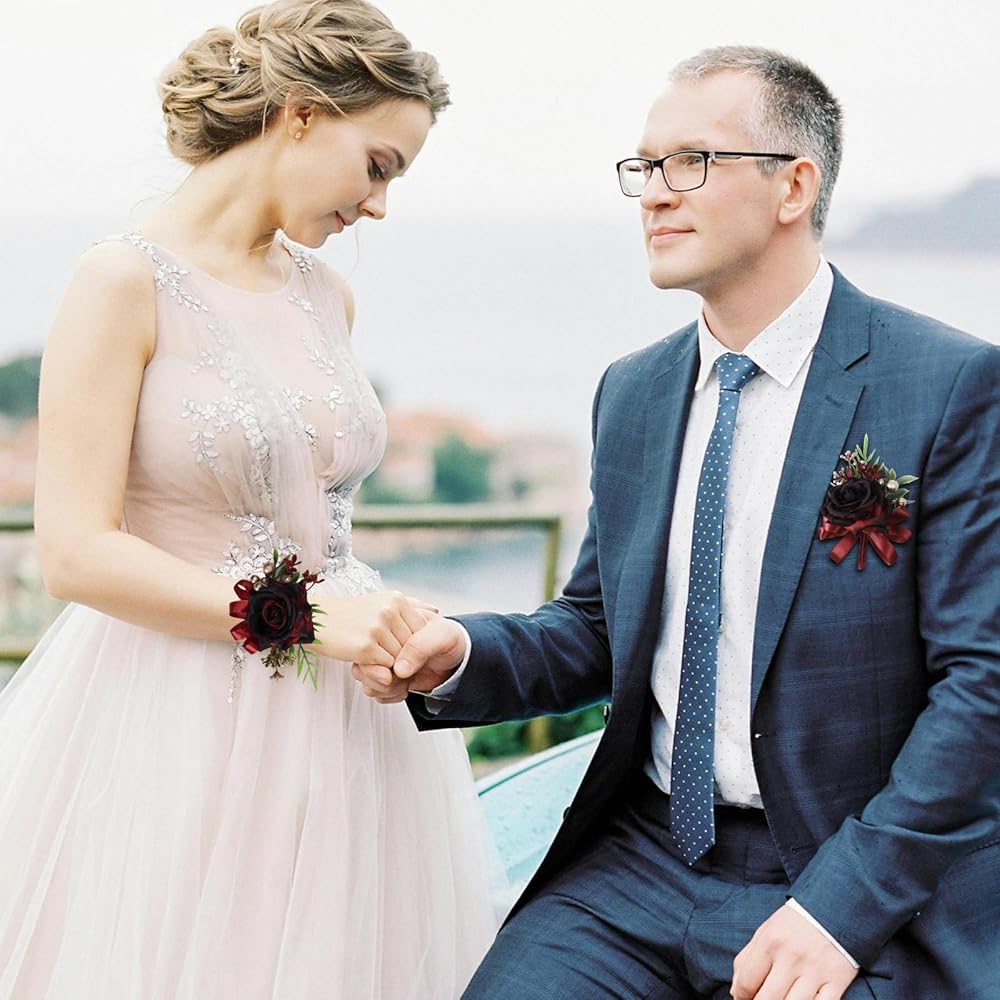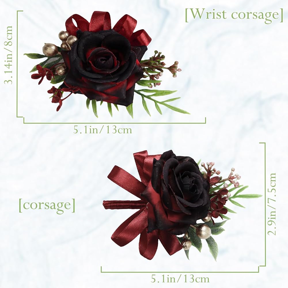 【PACKAGE INCLUDED】you will receive 1 pc wine red boutonniere about 13*7.5 cm / 5.1*2.9 inch and 1 pc wine red wrist corsage about 8*13 cm / 3.1*5.1 inch